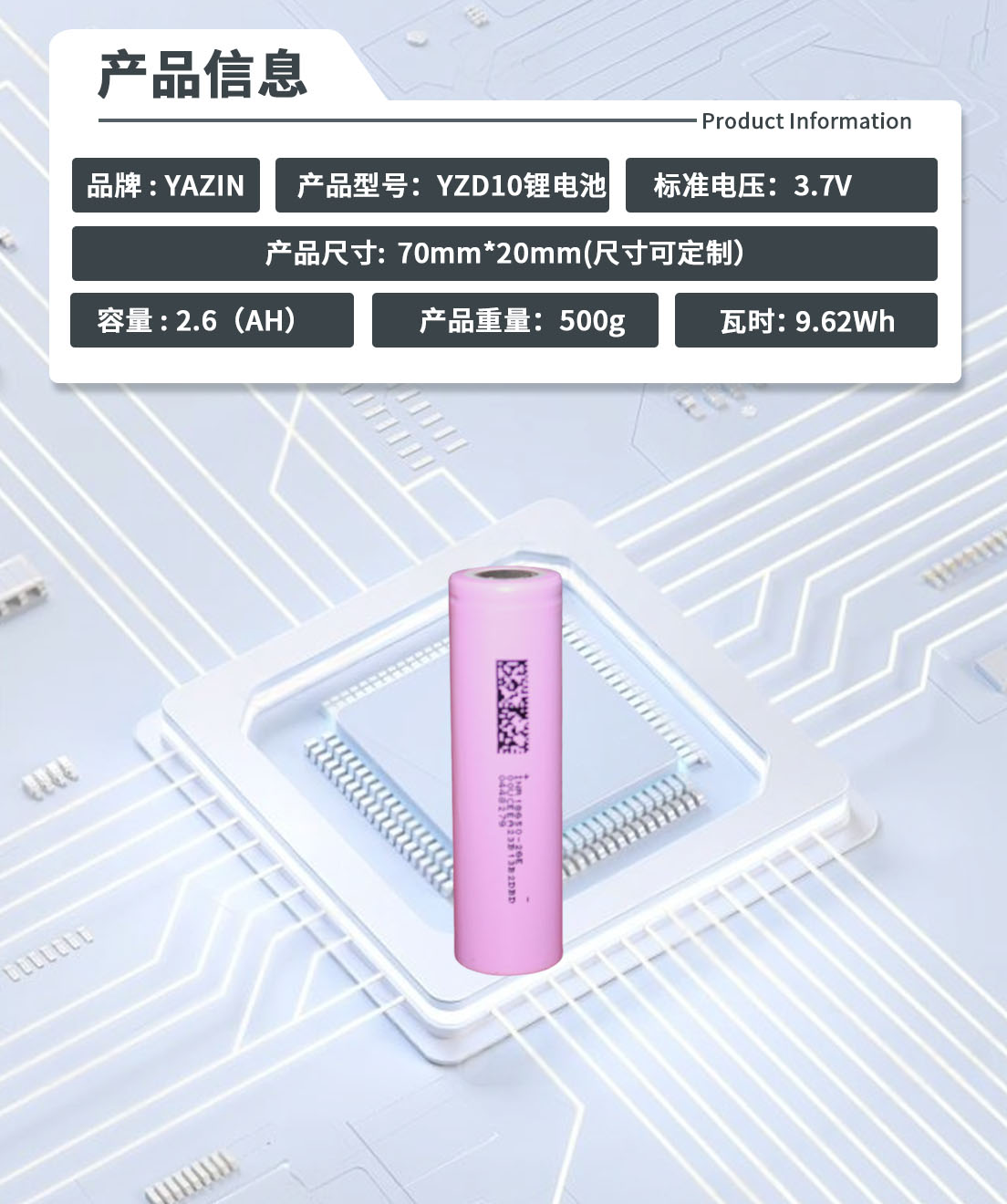 品牌 : YAZIN 产品型号:YZD10锂电池 标准电压:3.7V 额定容量:2.6(AH)尺寸: 70mm*12mm(尺寸可定制) 重量:500G 瓦时:9.62Wh