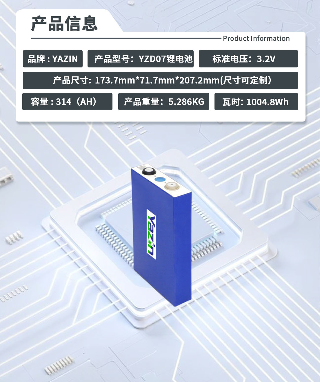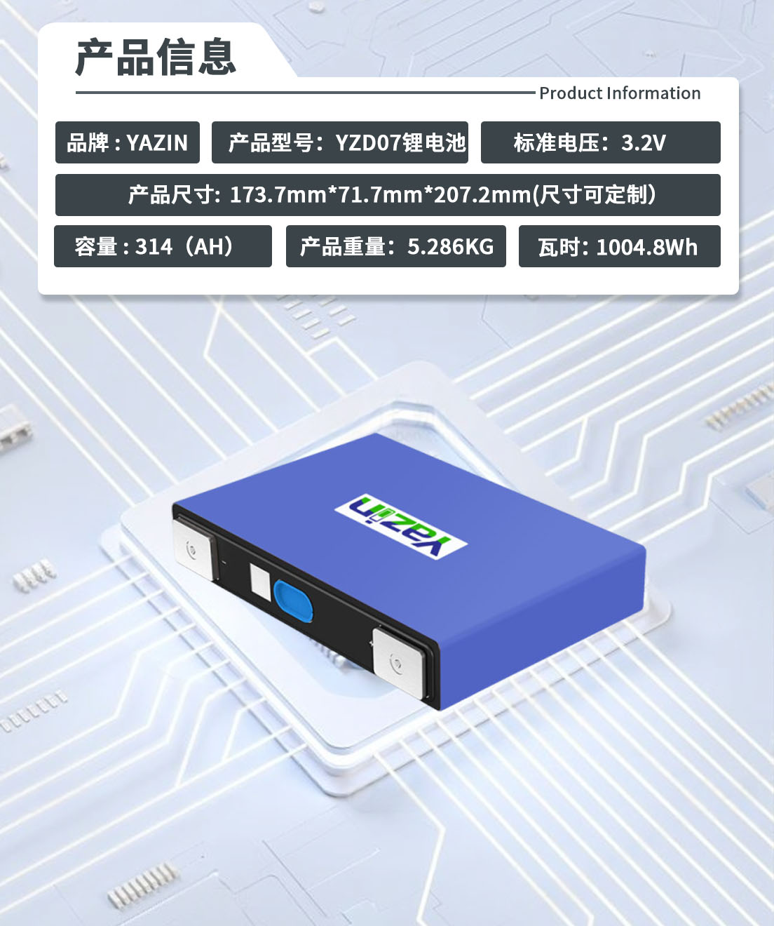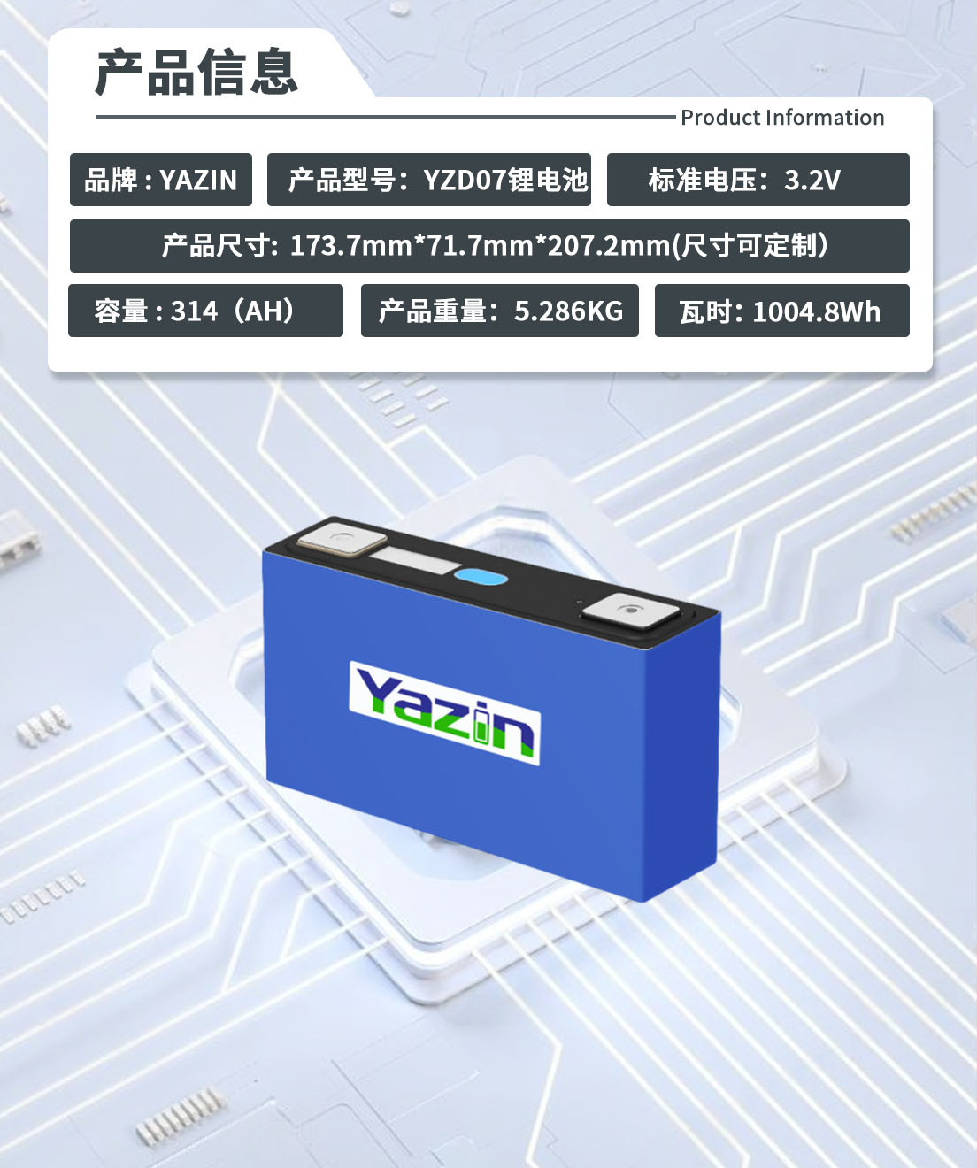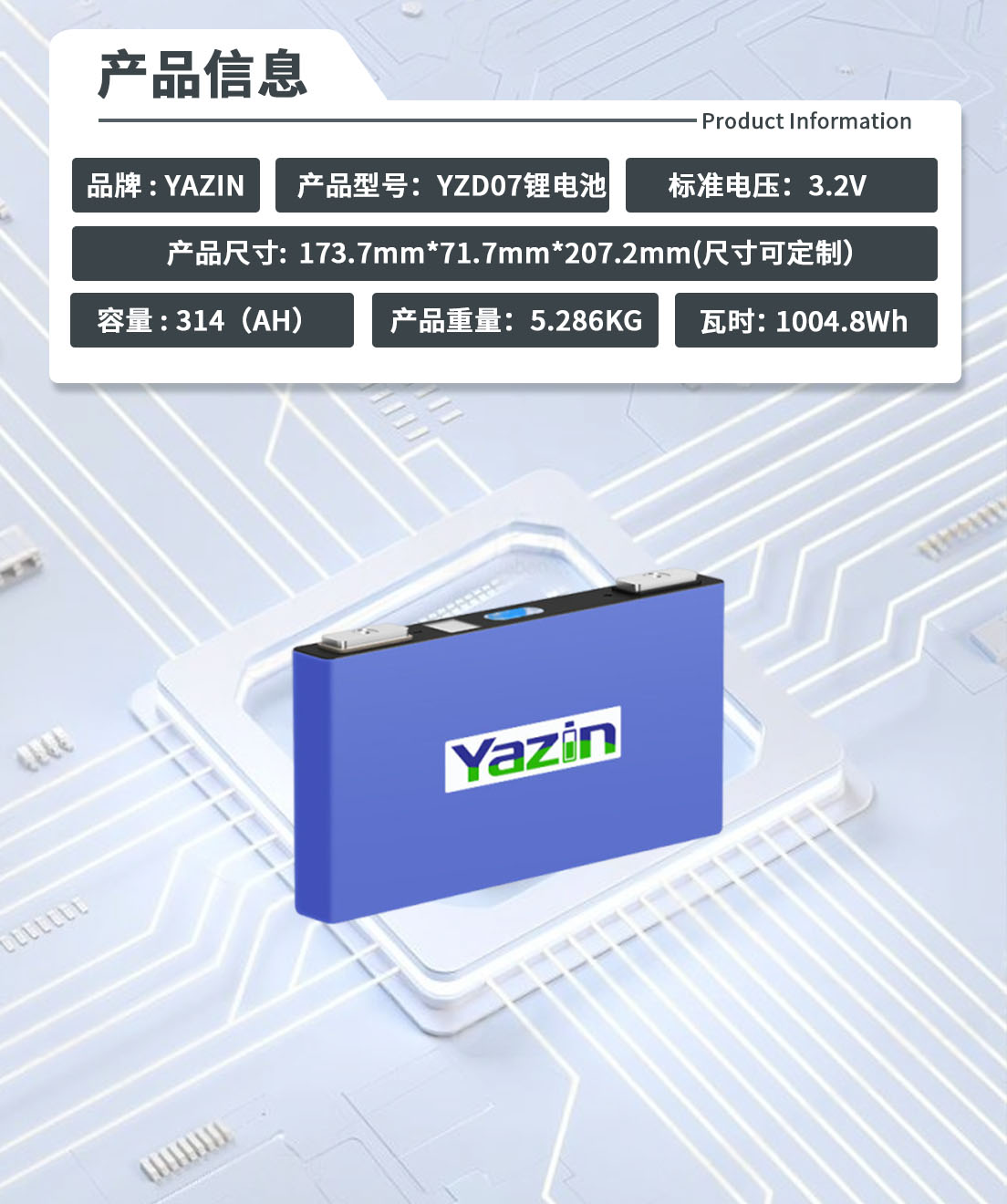品牌 : YAZIN 产品型号:YZD07锂电池 标准电压:3.2V 额定容量: 314(AH)尺寸: 173.7mm*71.7mm*207.2mm(尺寸可定制) 重量:5.286G 瓦时:1004.8Wh