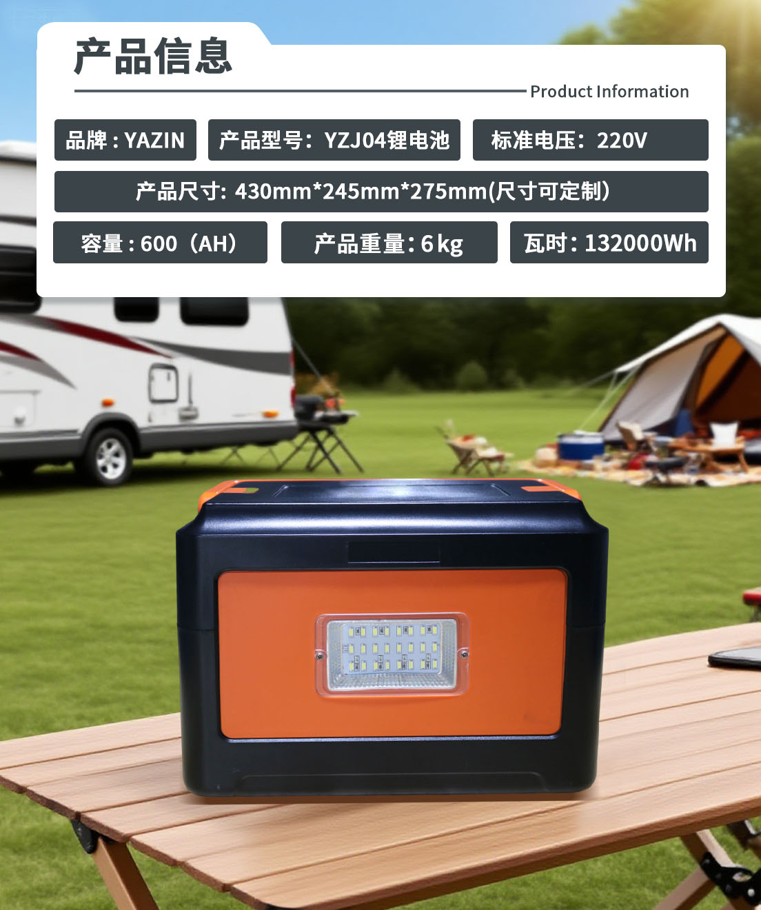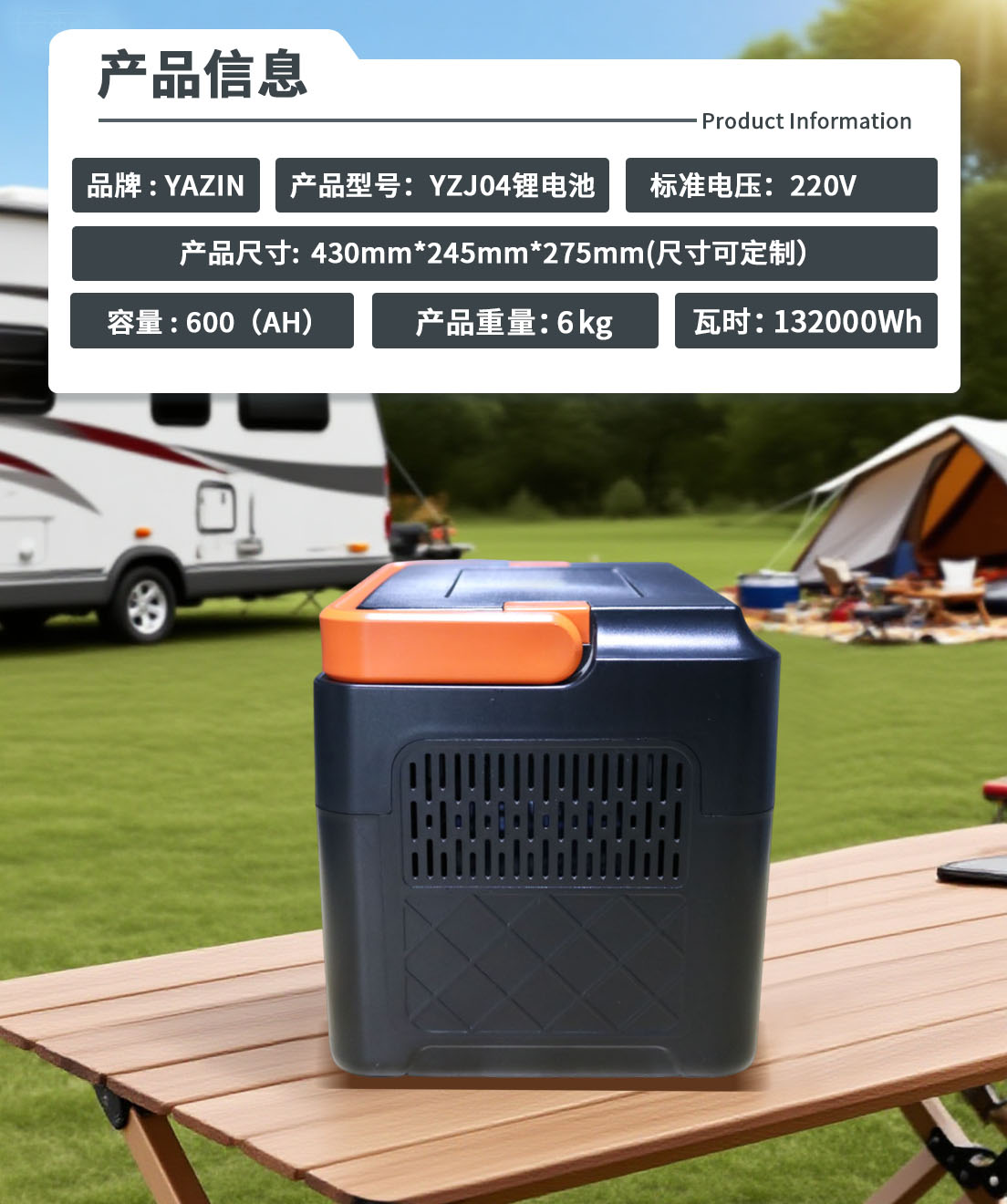 品牌 : YAZIN 产品型号:YZJ04锂电池 标准电压:220V 额定容量600(AH)尺寸: 293mm*220mm*205mm(尺寸可定制) 重量:6KG 瓦时:132000Wh
