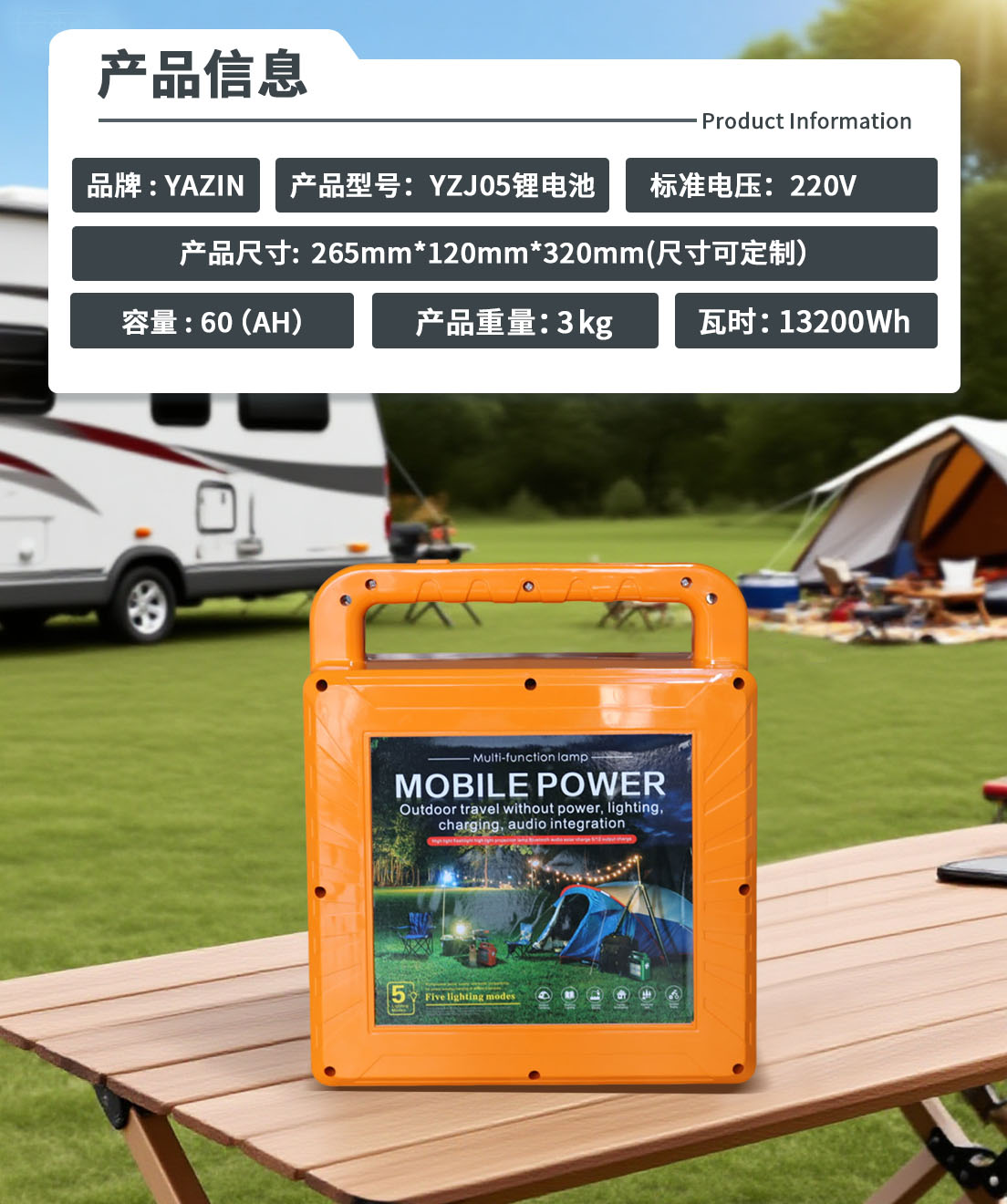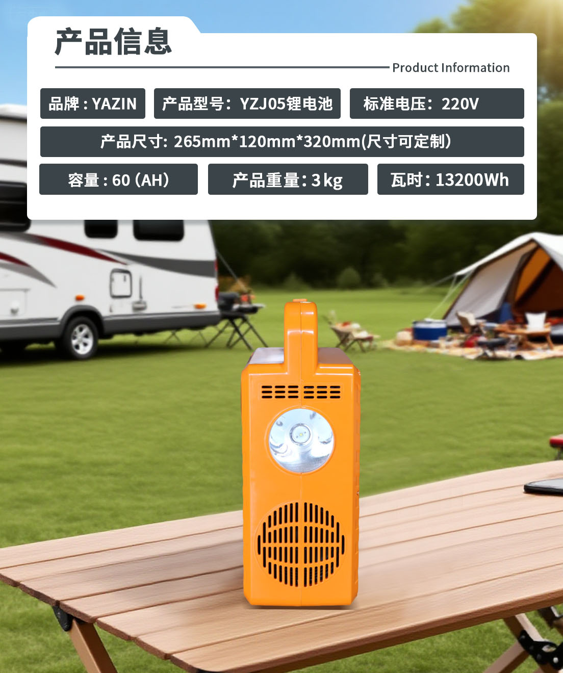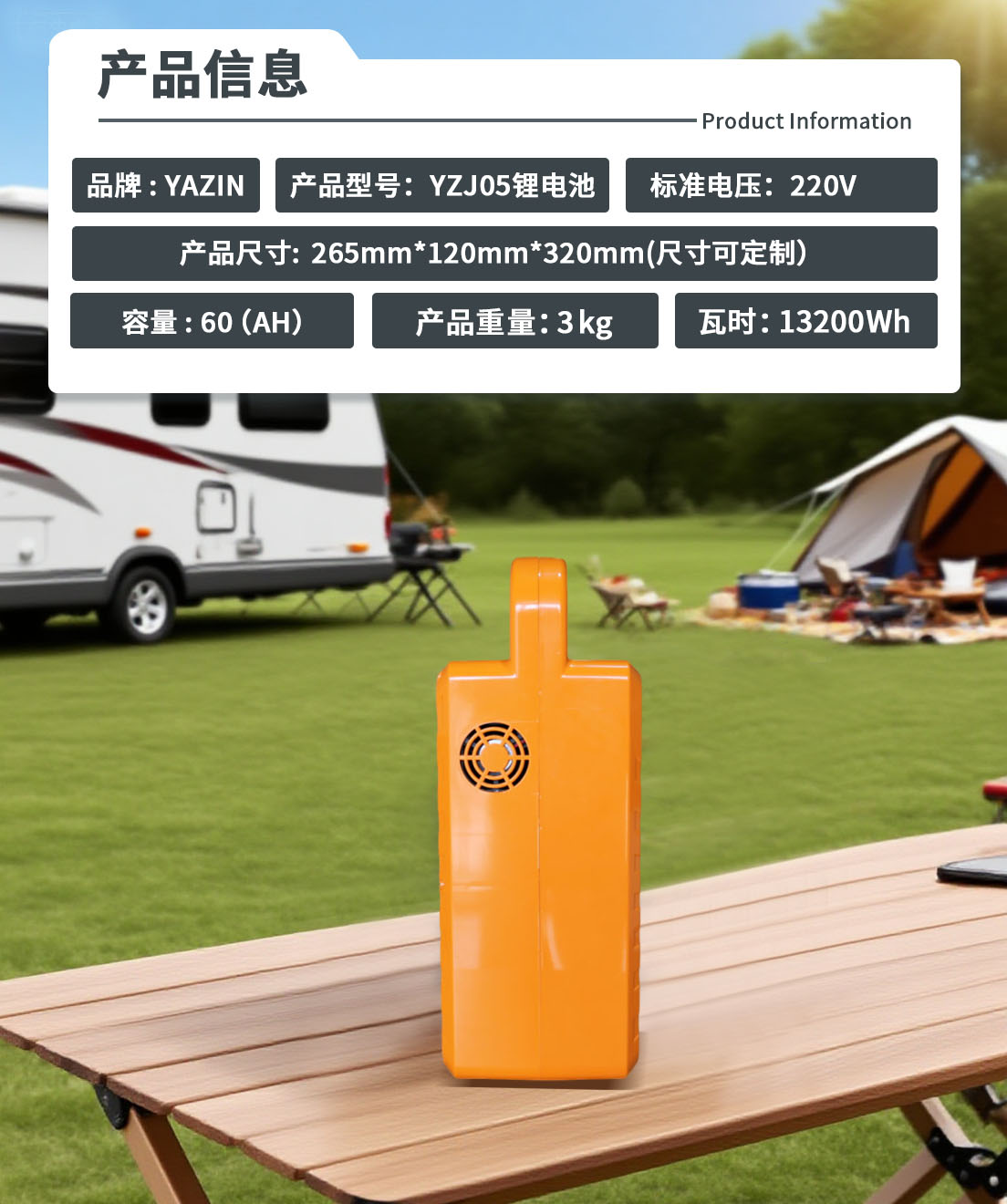 品牌 : YAZIN 产品型号:YZJ05锂电池 标准电压:220V 额定容量60(AH)尺寸: 265mm*120mm*320mm(尺寸可定制) 重量:3KG 瓦时:13200Wh