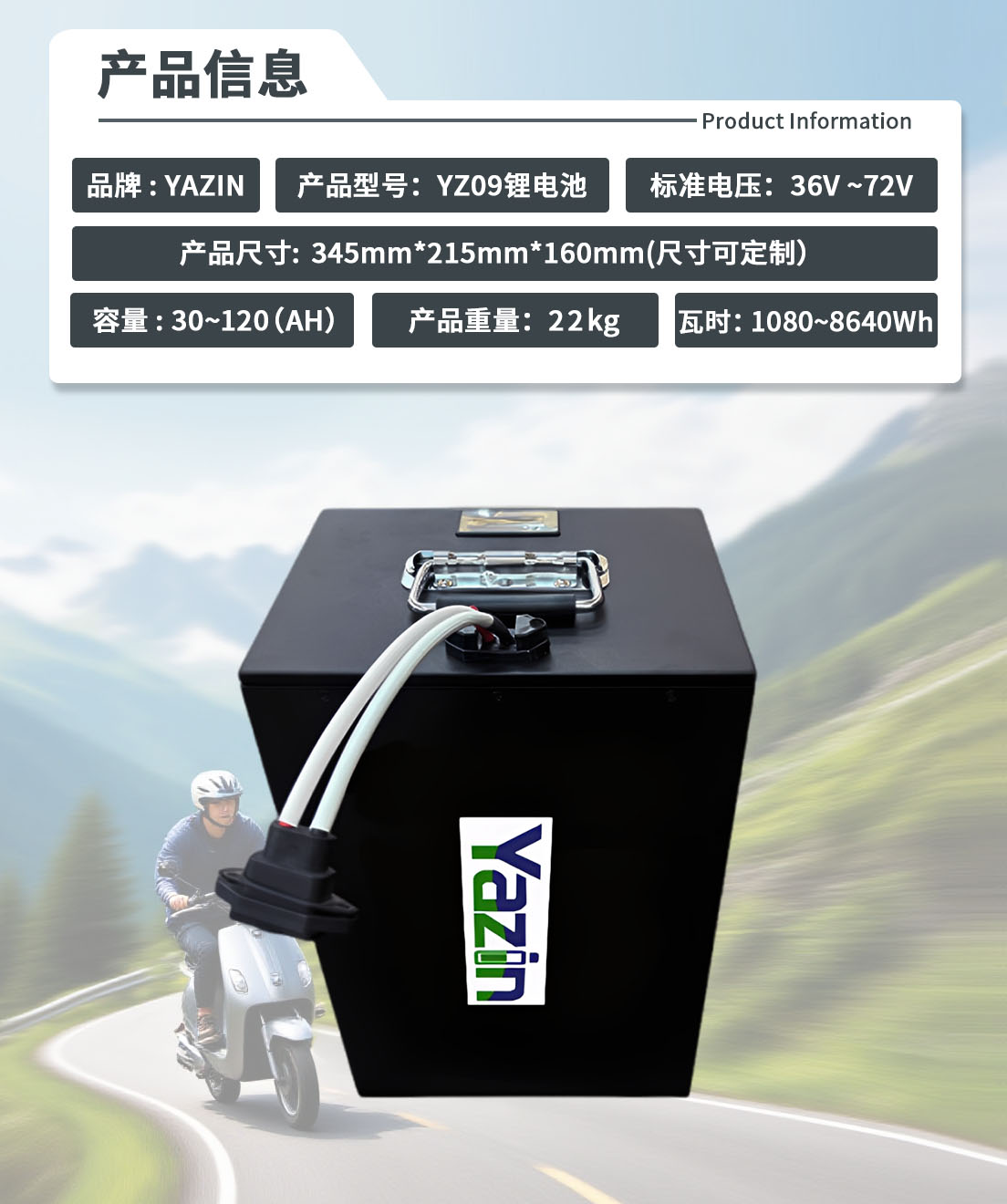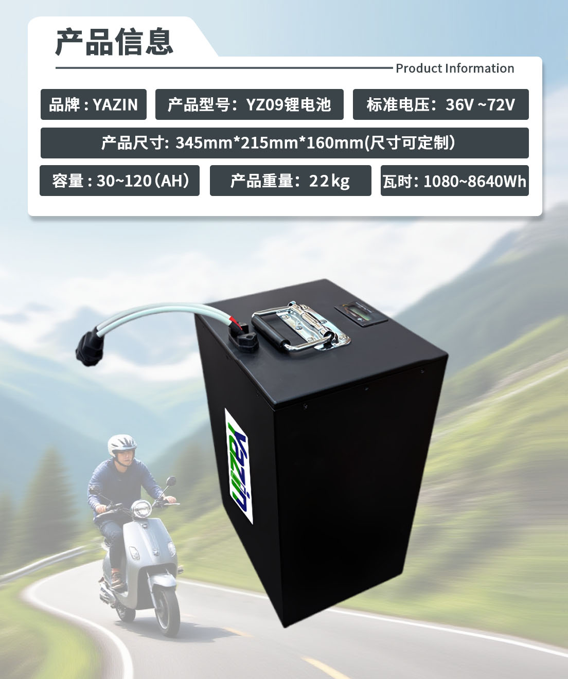 品牌 : YAZIN 产品型号:YZ09锂电池 标准电压:36V~72V 额定容量:30(AH)~120(AH)尺寸:345mm*215mm*160mm(尺寸可定制) 重量:22kg 瓦时:1080~8640W