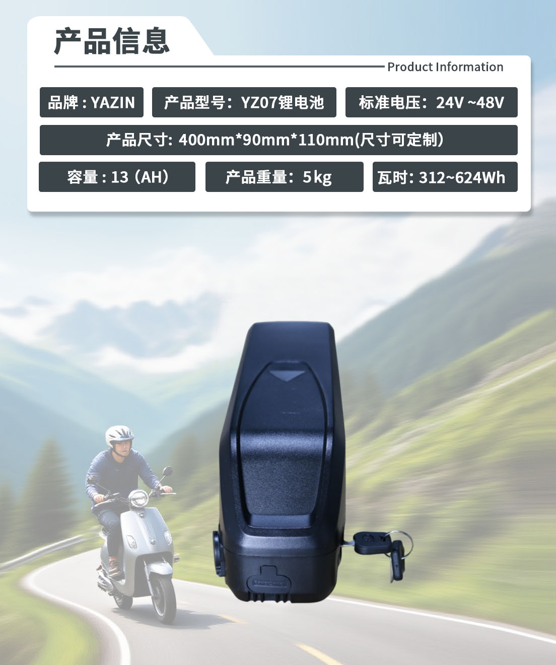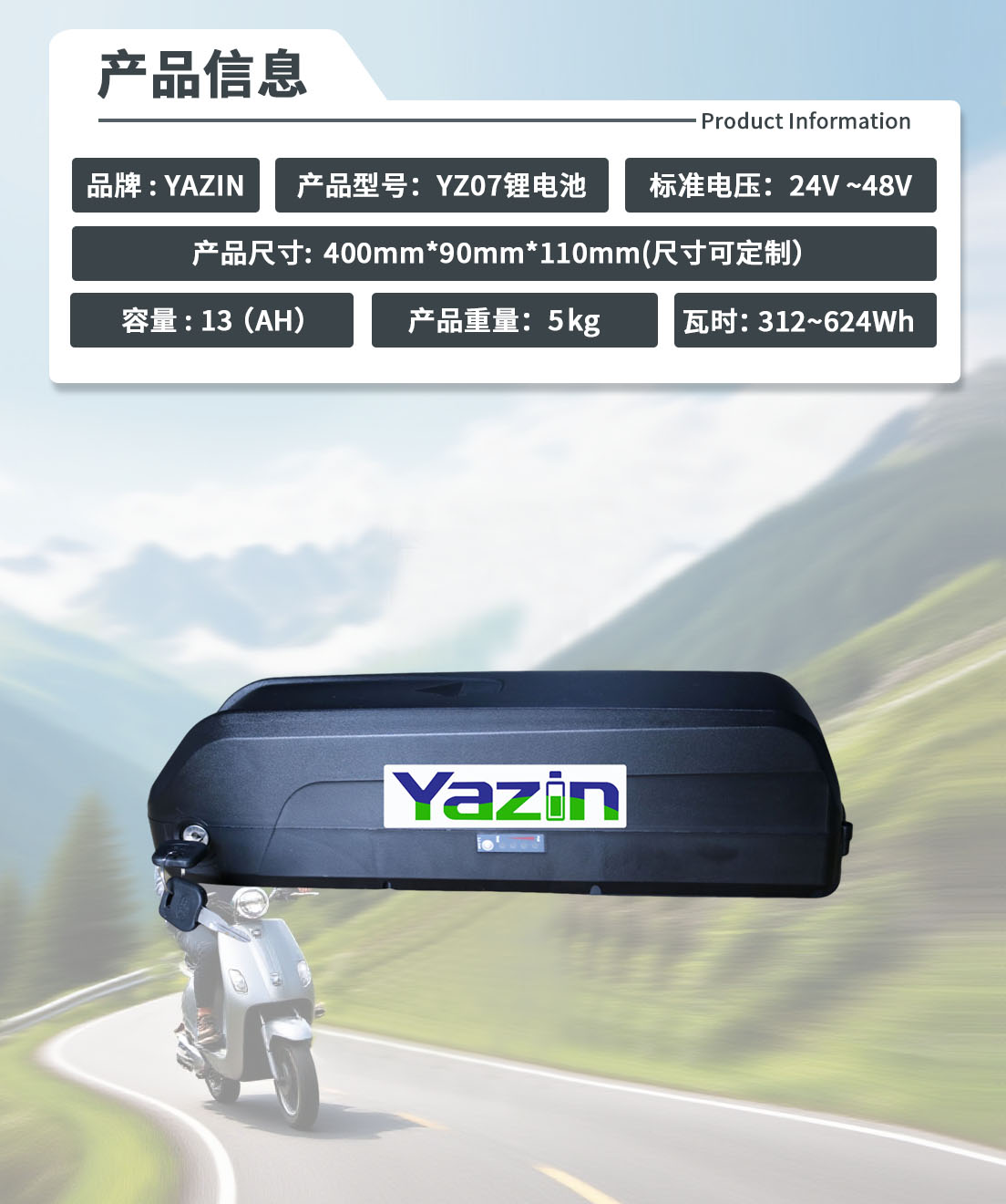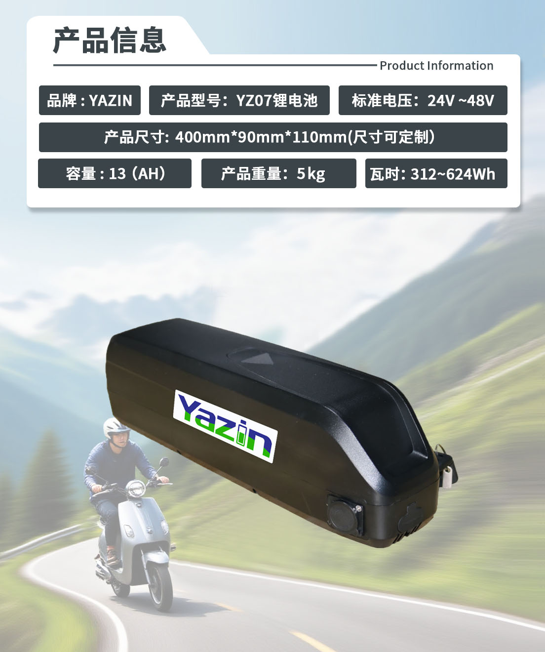 品牌 : YAZIN 产品型号:YZ07锂电池 标准电压:24V-48V 额定容量:13(AH)尺寸:400mm*90mm*110mm(尺寸可定制) 重量:5kg 瓦时: 312Wh~624Wh