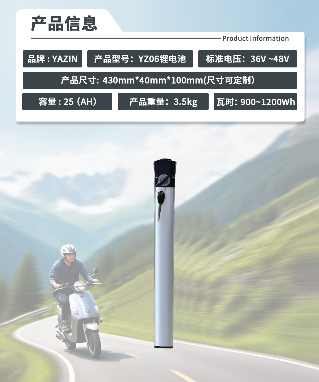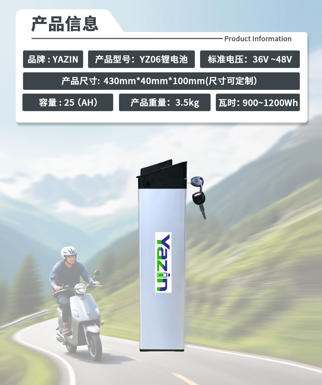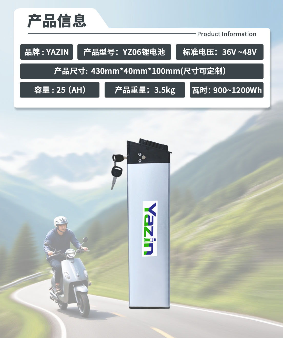 品牌 : YAZIN 产品型号:YZ06锂电池 标准电压:36V-48V 额定容量:25(AH)尺寸:430mm*40mm*100mm(尺寸可定制) 重量:3.5kg 瓦时: 900Wh~1200Wh