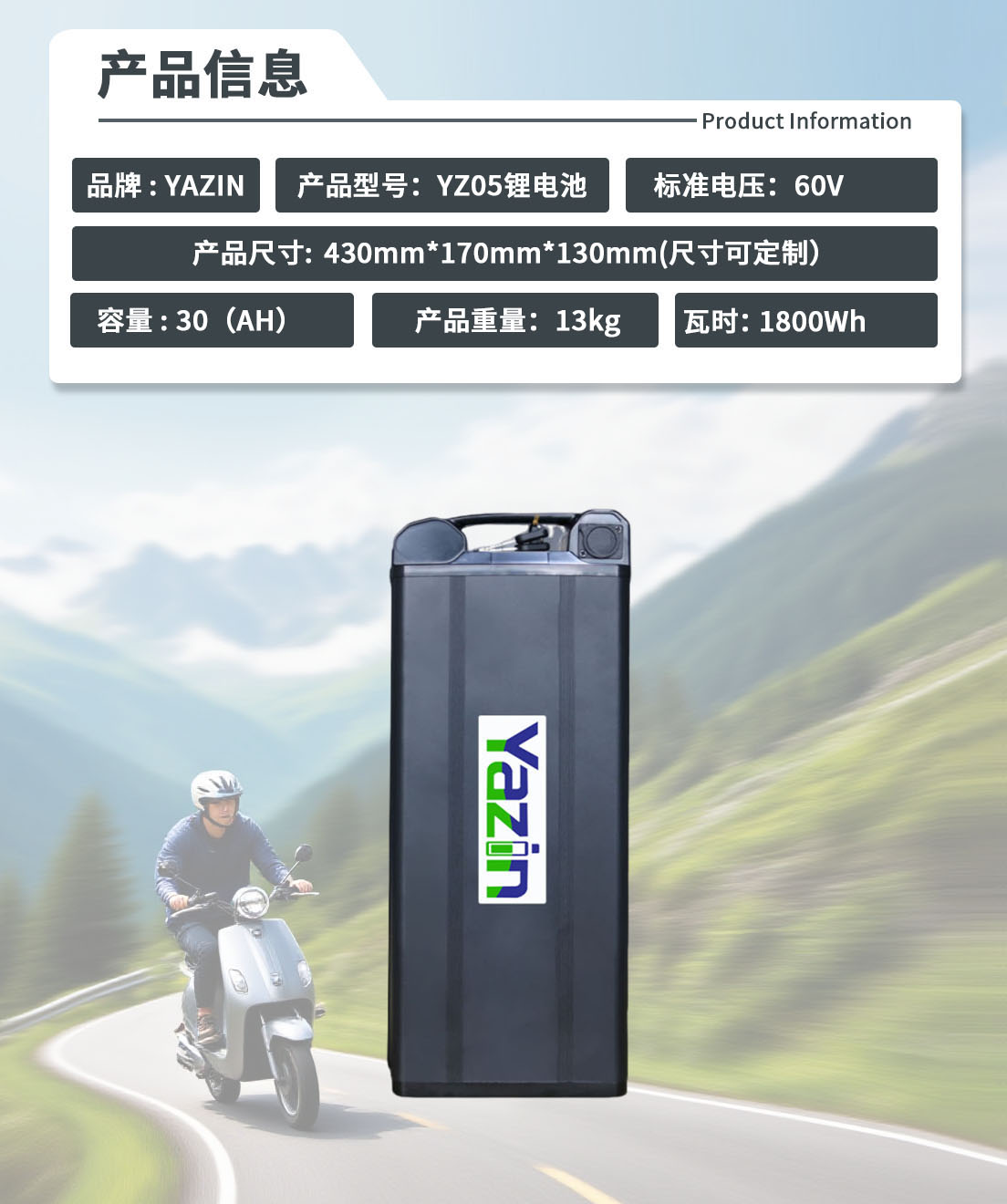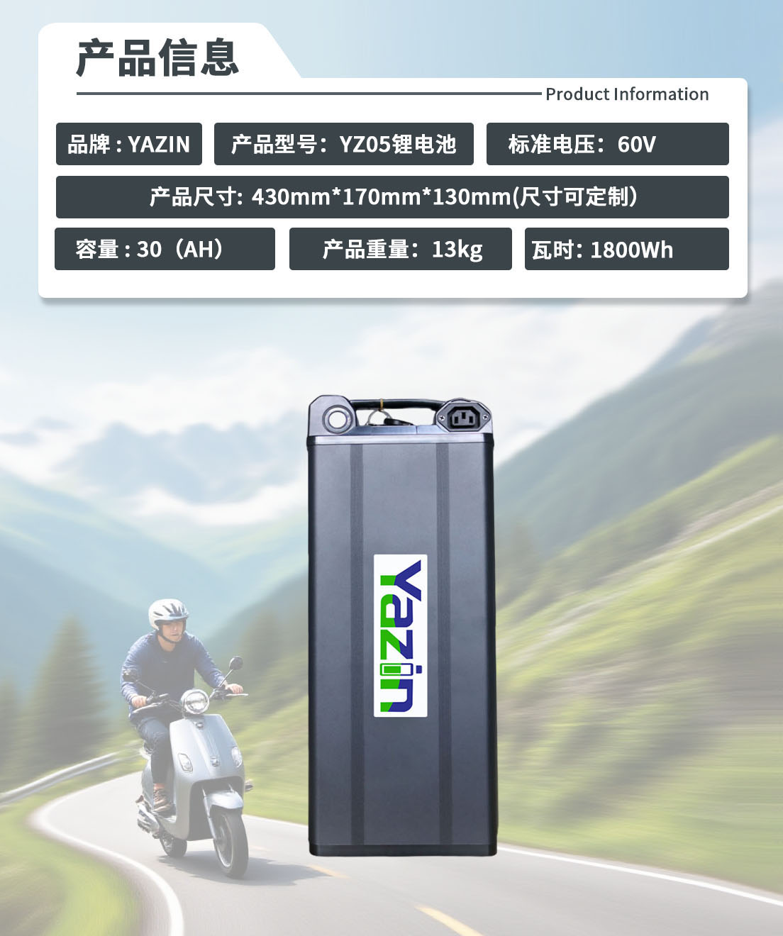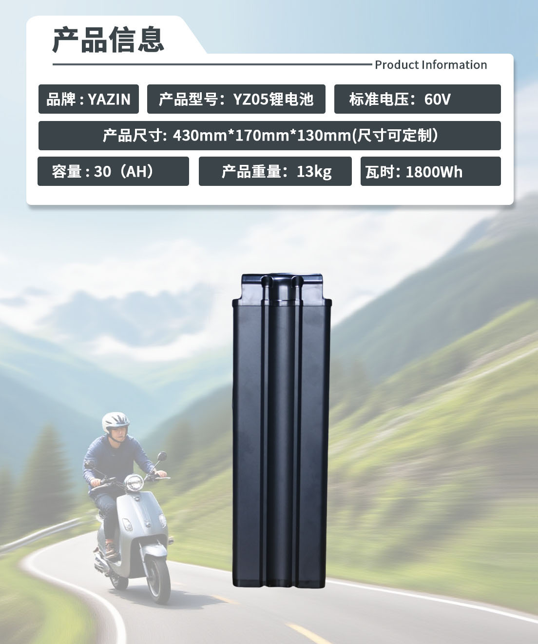 品牌 : YAZIN 产品型号:YZ05锂电池 标准电压:60V 额定容量:30(AH) 尺寸:430mm*170mm*130mm(尺寸可定制) 重量:13kg 瓦时: 1800Wh