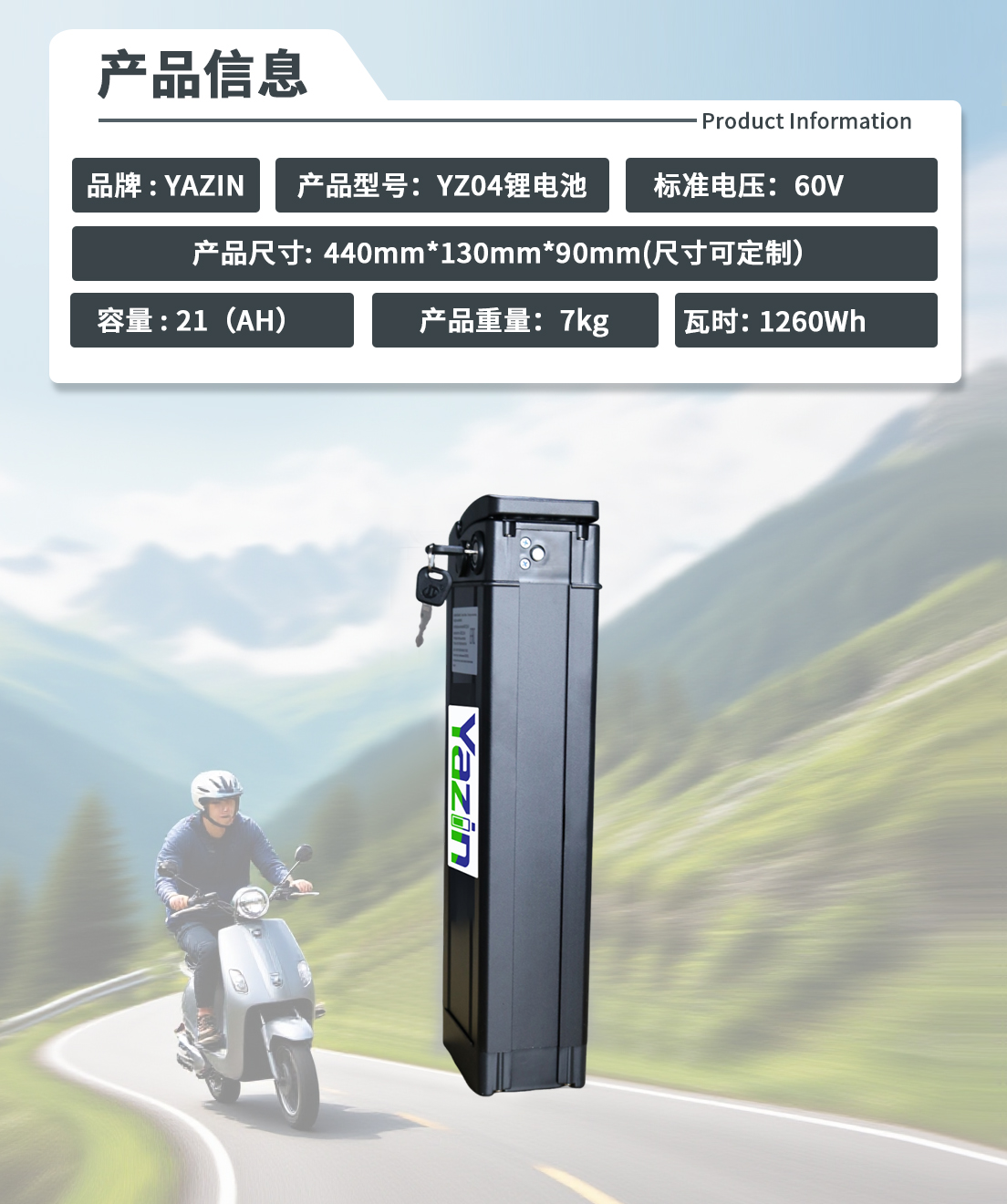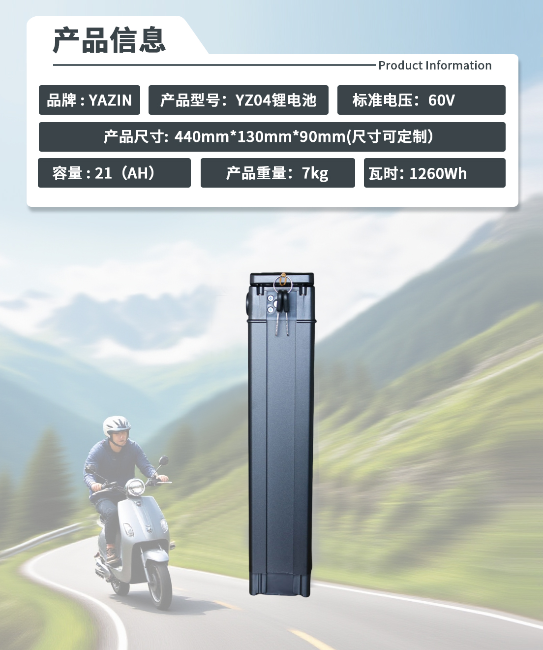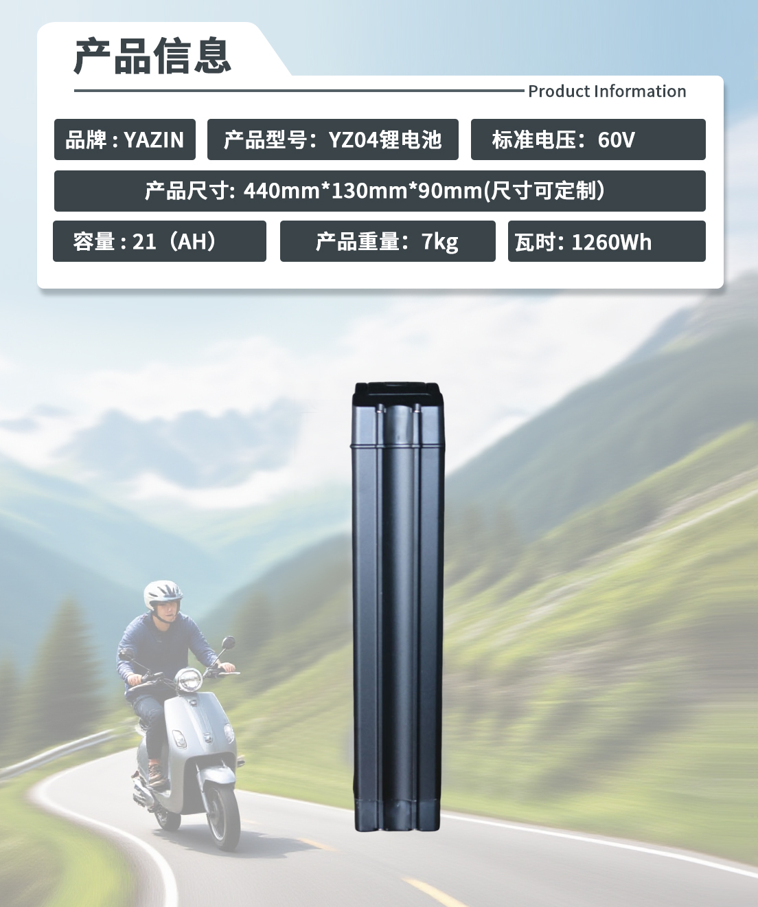 品牌 : YAZIN 产品型号:YZ04锂电池 标准电压:60V 额定容量:21(AH) 尺寸:440mm*130mm*90mm(尺寸可定制) 重量:7kg 瓦时: 1260Wh
