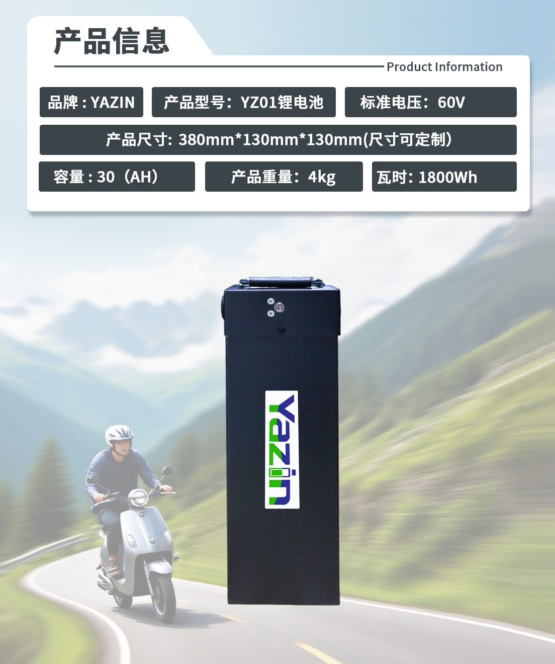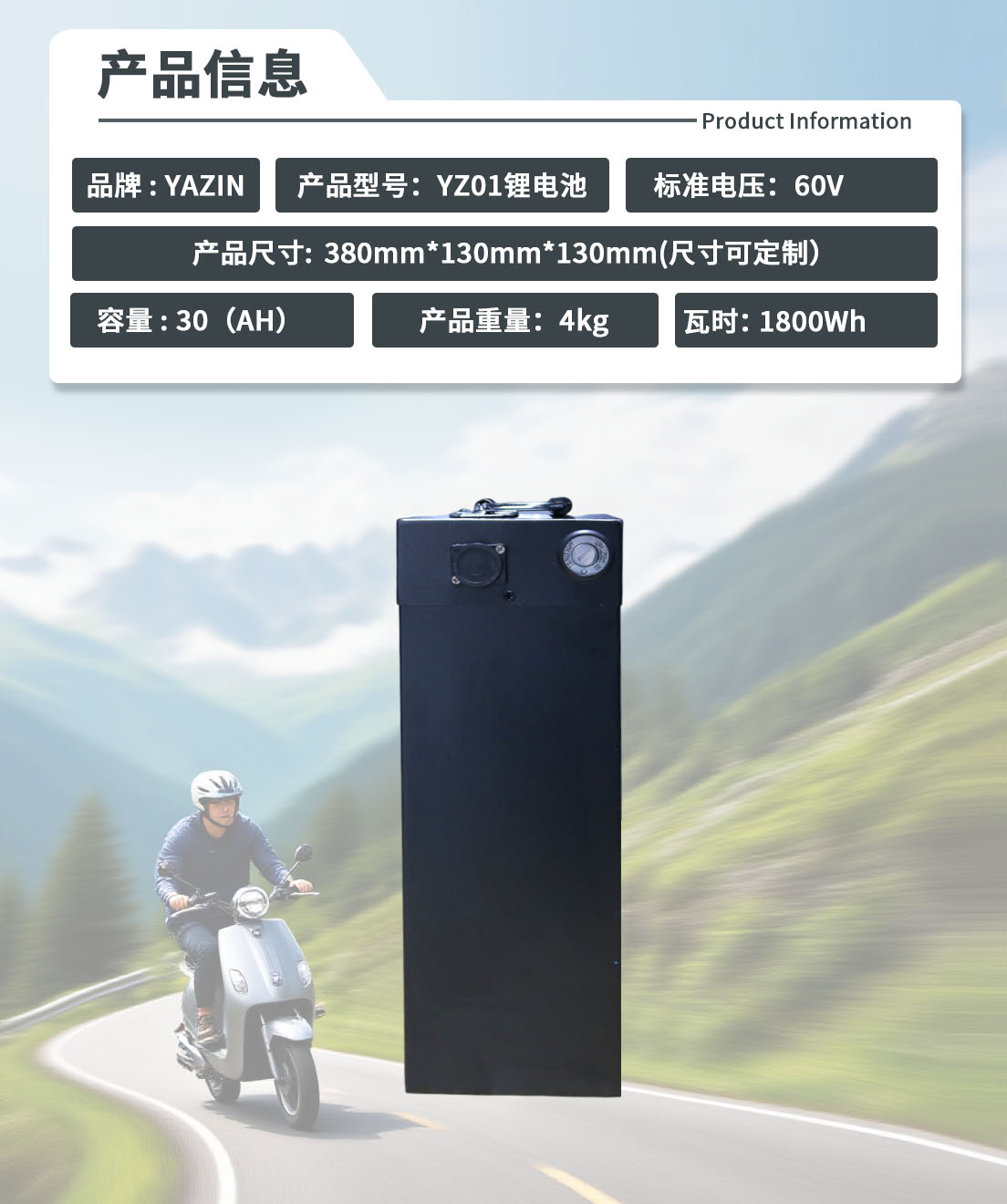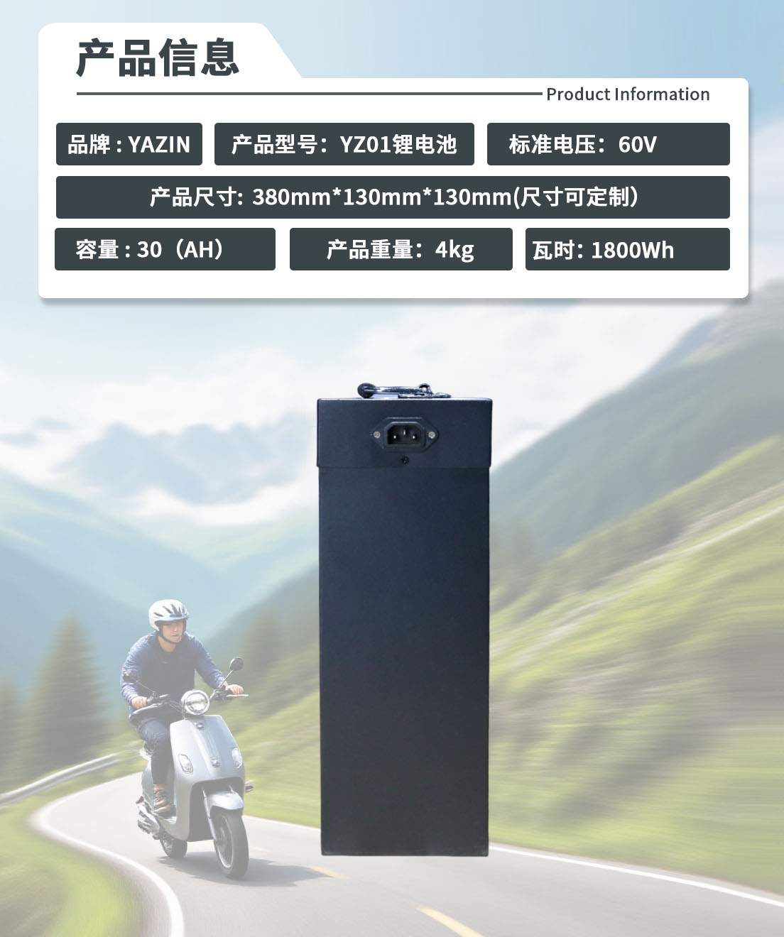 品牌 : YAZIN 产品型号:YZ01锂电池 标准电压:60V 额定容量:30(AH) 尺寸::380mm*130mm*130mm(尺寸可定制) 重量:4kg 瓦时: 1800Wh