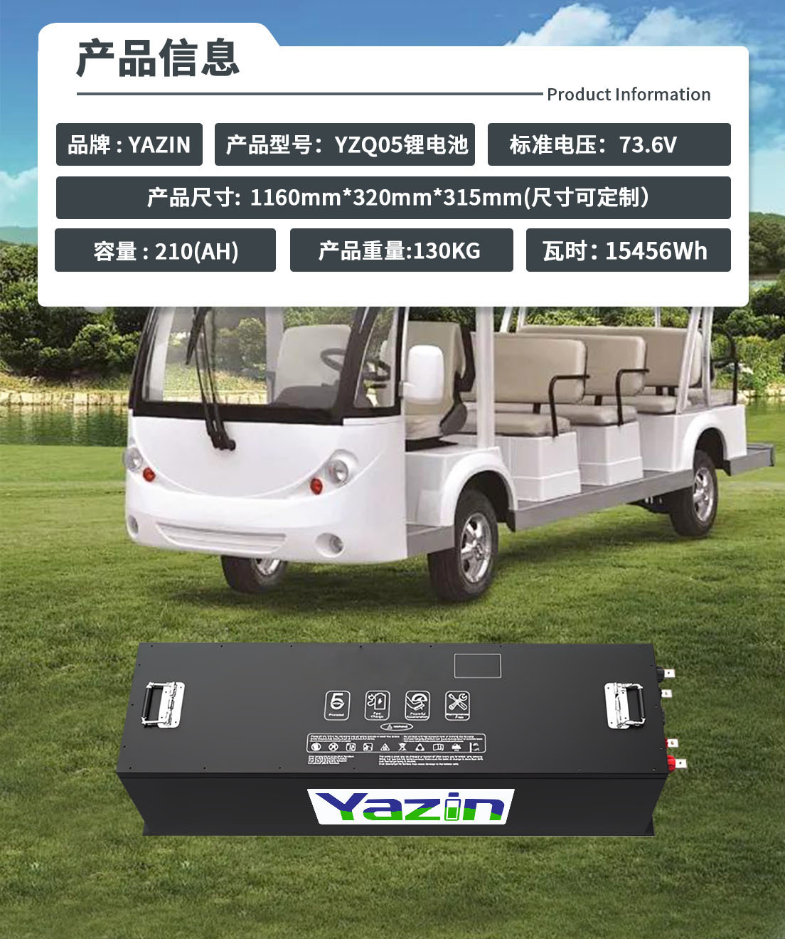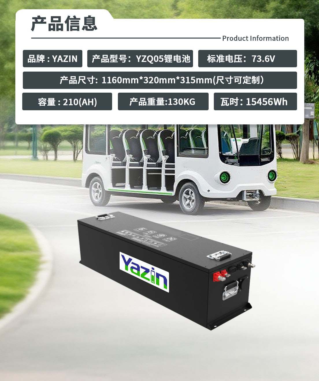 品牌 : YAZIN 产品型号:YZQ05锂电池 标准电压:73.6V 额定容量: 210(AH) 尺寸: 1160mm*320mm*315mm(尺寸可定制) 重量:130KG 瓦时:15456Wh