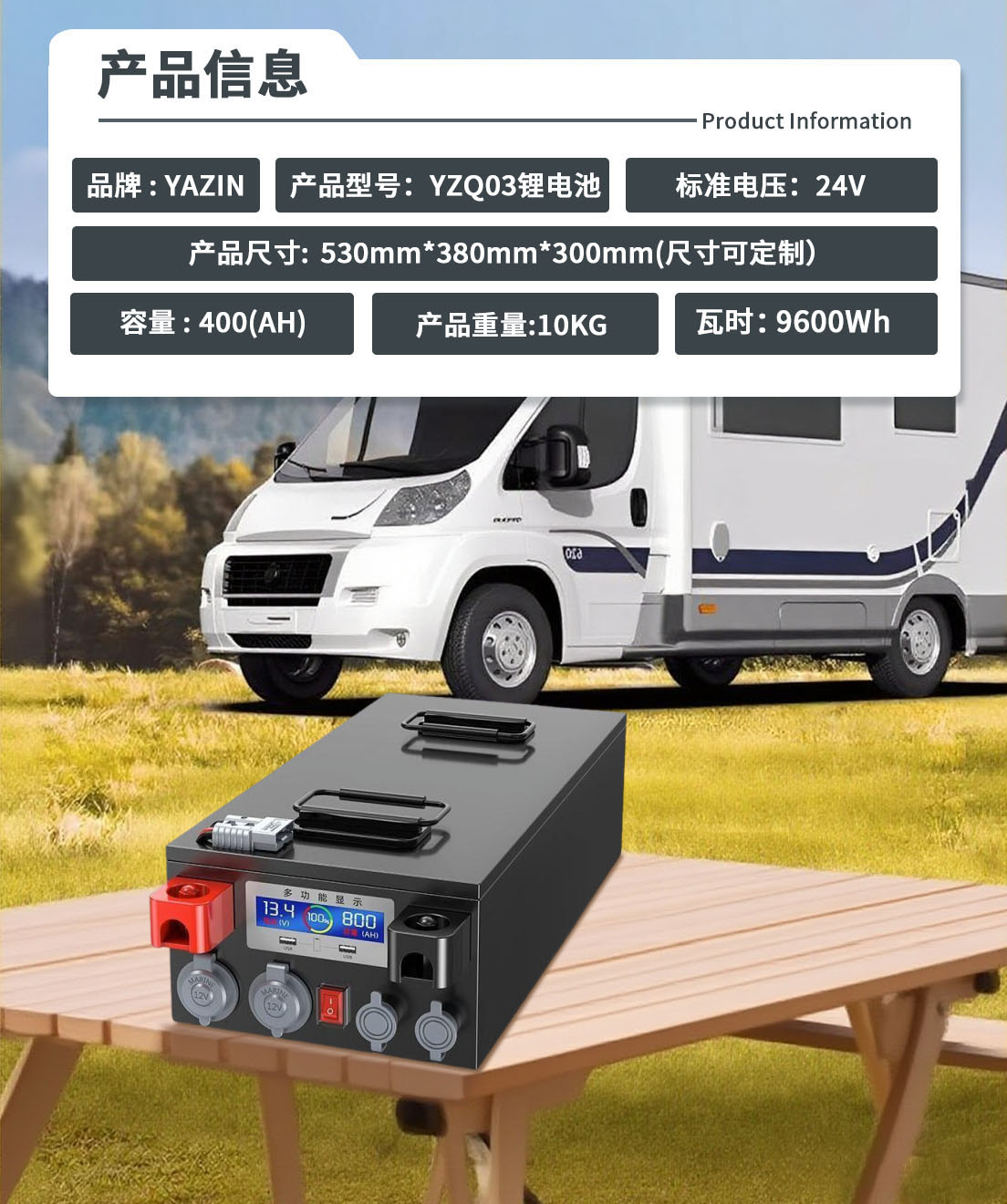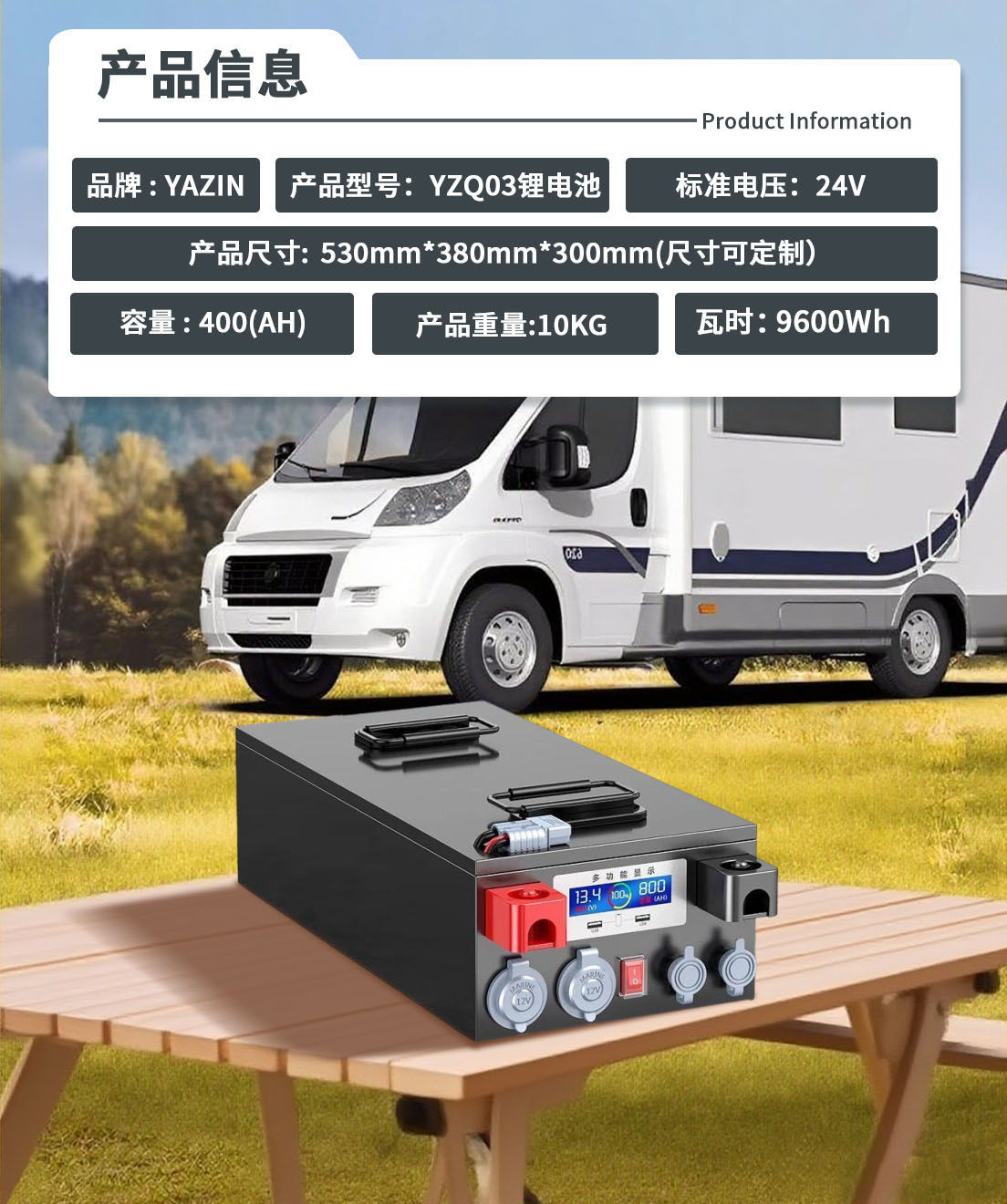 品牌 : YAZIN 产品型号:YZQ03锂电池 标准电压:24V 额定容量:400(AH) 尺寸: 530mm*380mm*300mm(尺寸可定制) 重量:10KG 瓦时:9600Wh