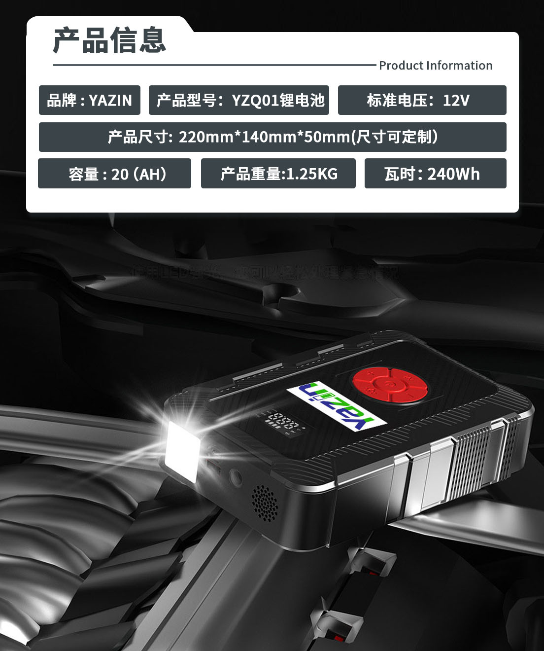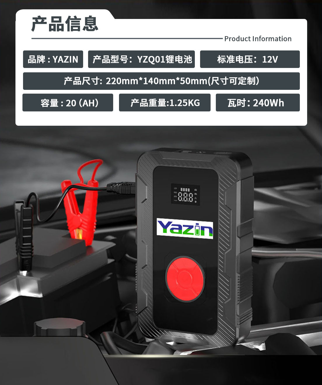 品牌 : YAZIN 产品型号:YZQ01锂电池 标准电压:12V 额定容量: 20(AH) 尺寸: 220mm*140mm*50mm(尺寸可定制) 重量:1.25KG 瓦时:240Wh