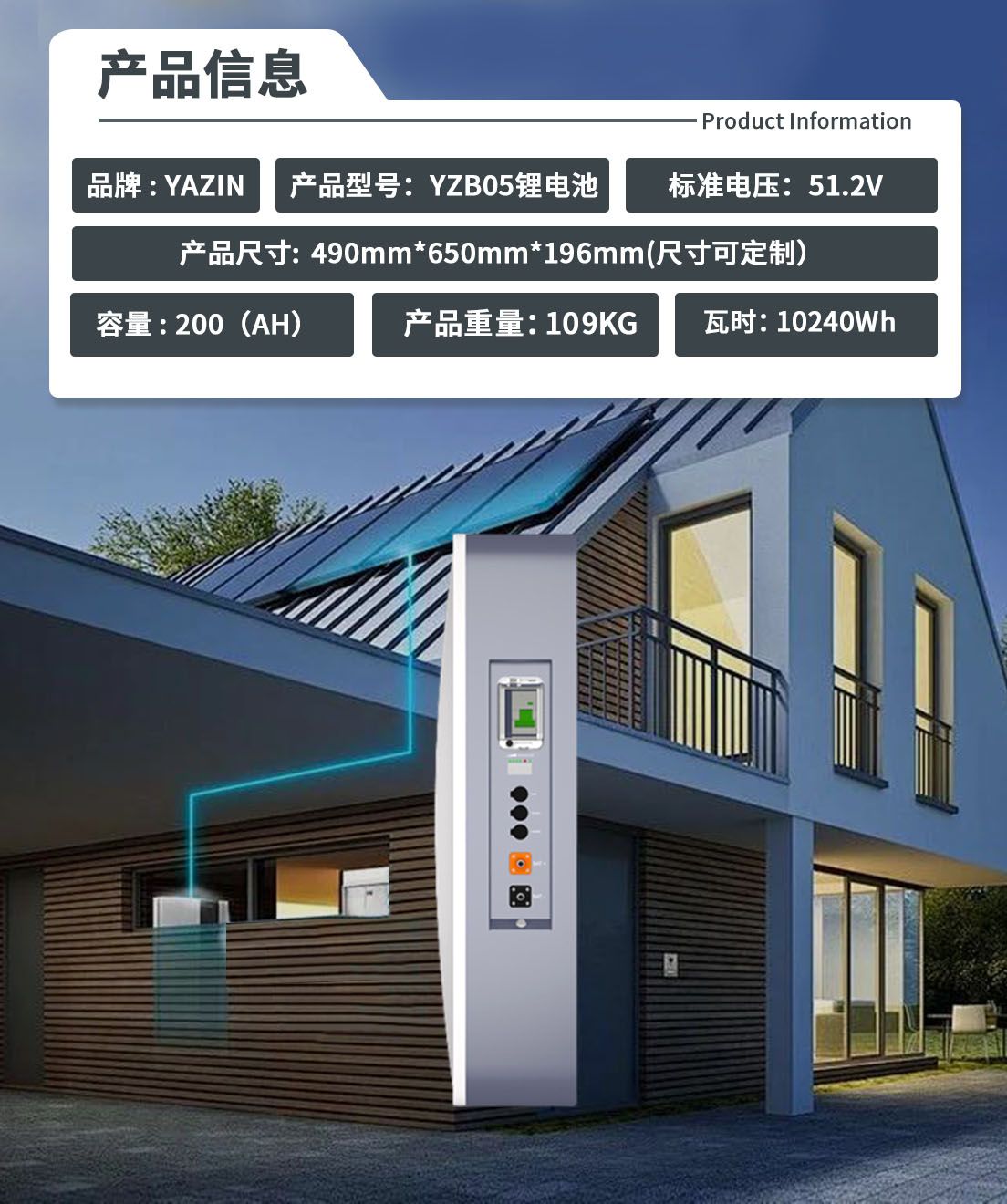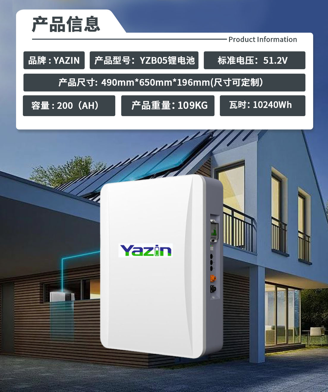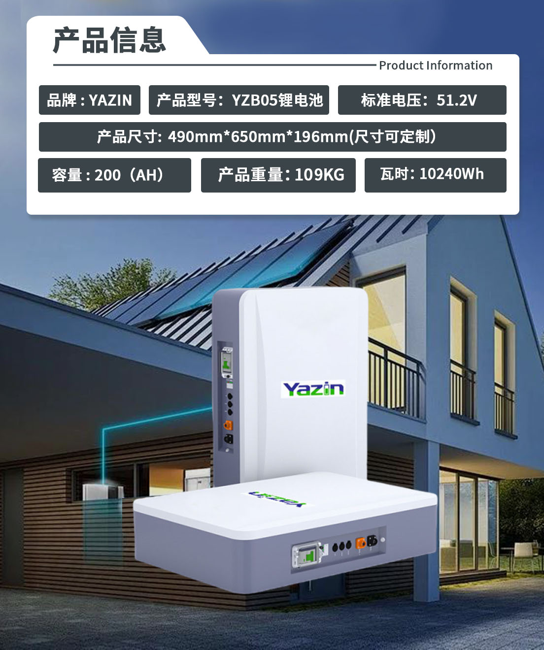 品牌 : YAZIN 产品型号:YZB05锂电池 标准电压:51.2V 额定容量:200(AH) 尺寸: 490mm*650mm*196mm(尺寸可定制) 重量:109KG 瓦时:10240Wh
