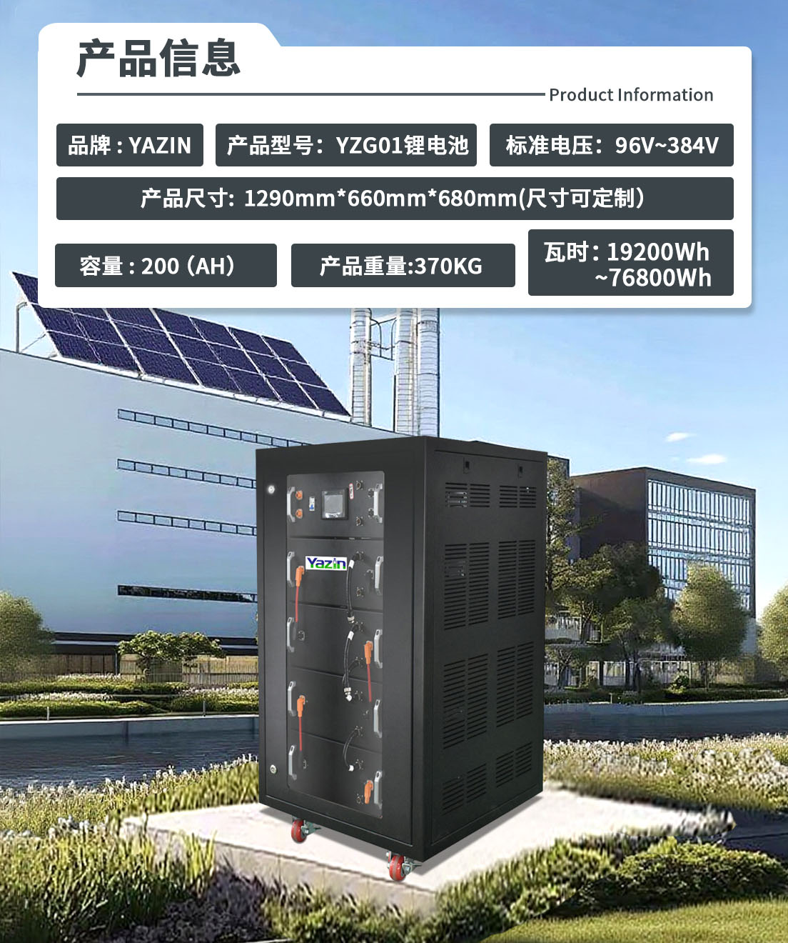 品牌 : YAZIN 产品型号:YZG01锂电池 标准电压:96V~384V 额定容量:200(AH) 尺寸:1290mm*660mm*680mm(尺寸可定制) 重量:370kg 瓦时:19200Wh~76800Wh