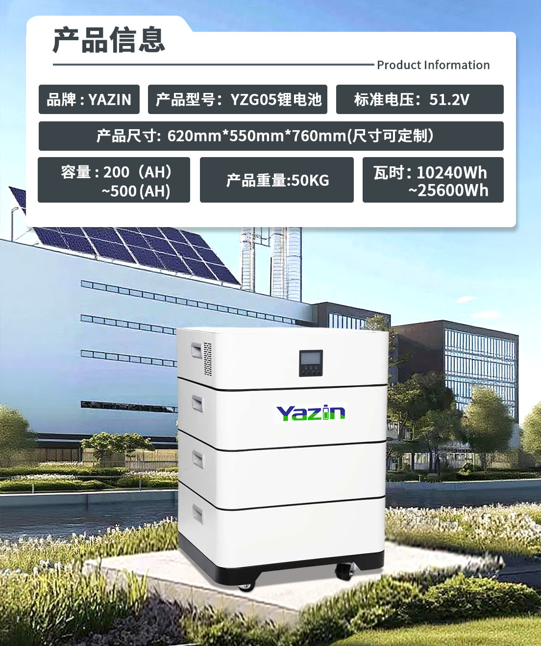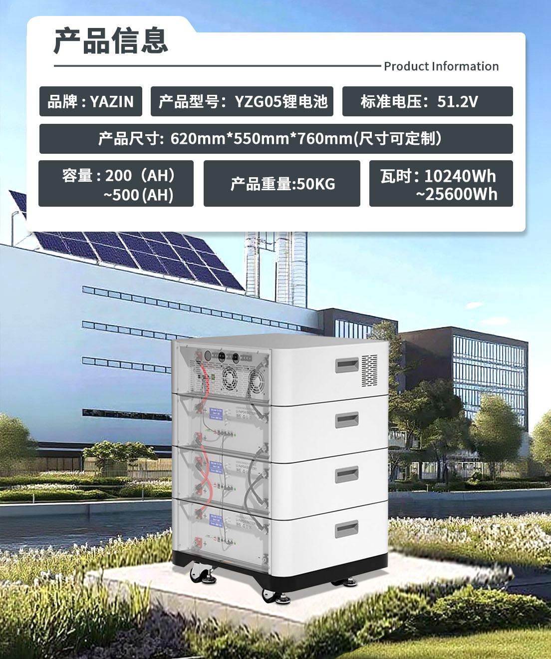 品牌 : YAZIN 产品型号:YZG05锂电池 标准电压:51.2V 额定容量:200~500(AH) 尺寸:620mm*550mm*760mm(尺寸可定制) 重量:50KG 瓦时: 10240Wh~25600Wh