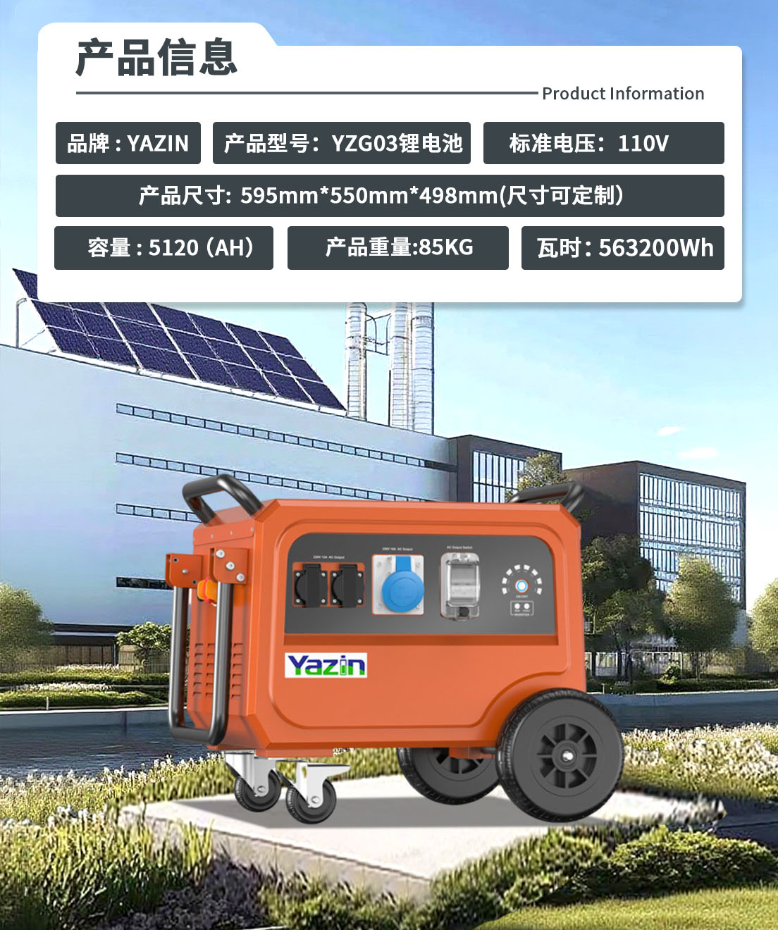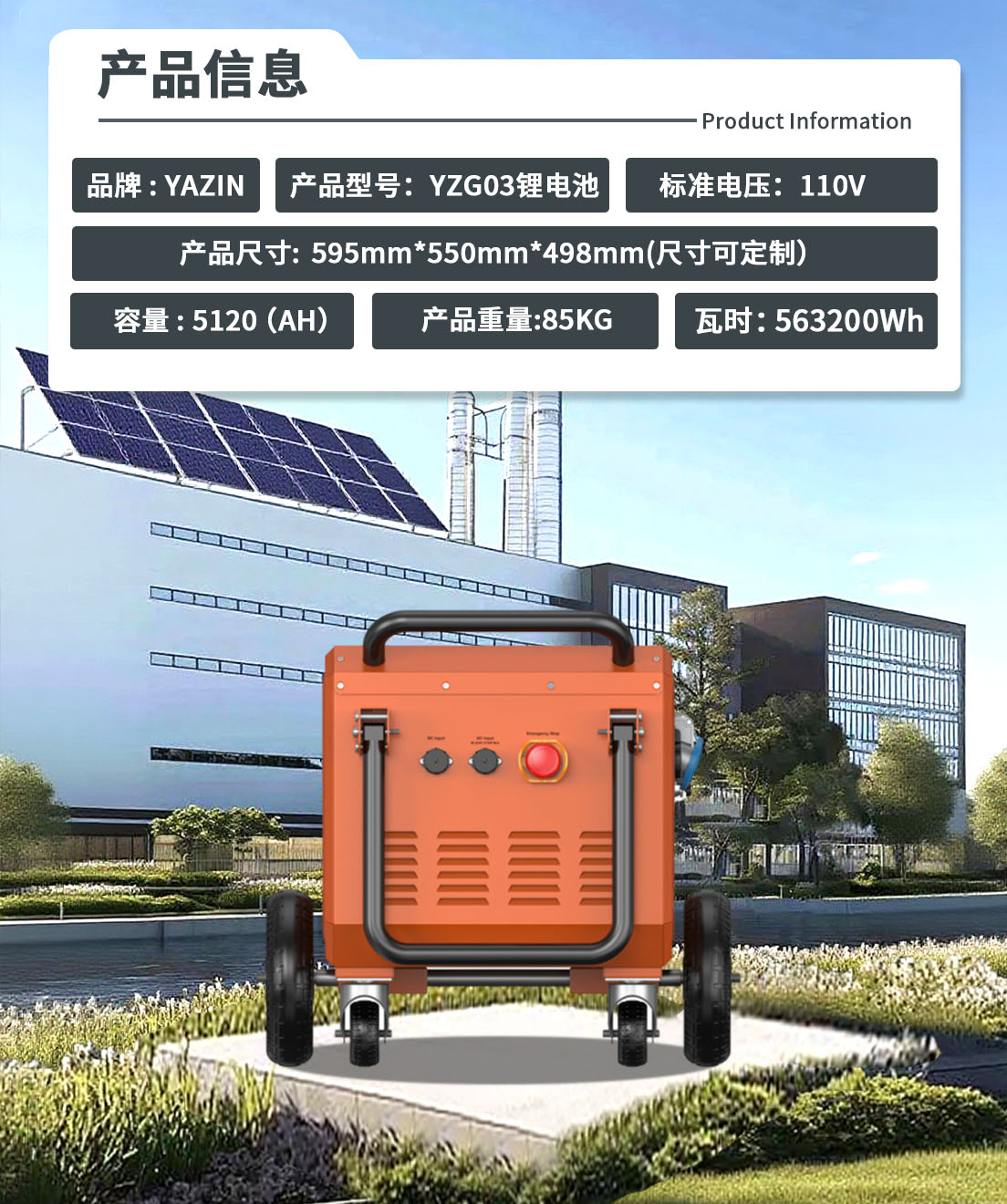 品牌 : YAZIN 产品型号:YZG03锂电池 标准电压:110V 额定容量:5120(AH) 尺寸:595mm*550mm*498mm(尺寸可定制) 重量:85kg 瓦时: 563.2Wh