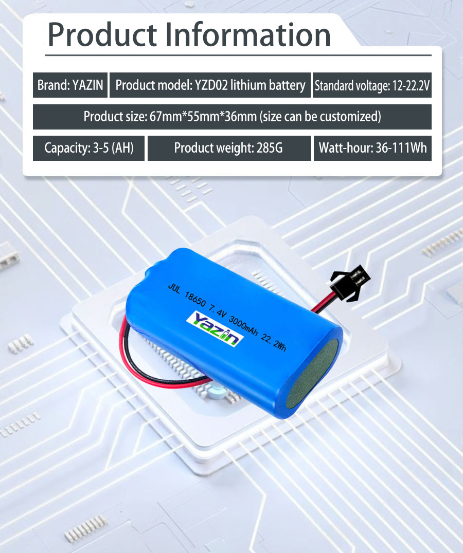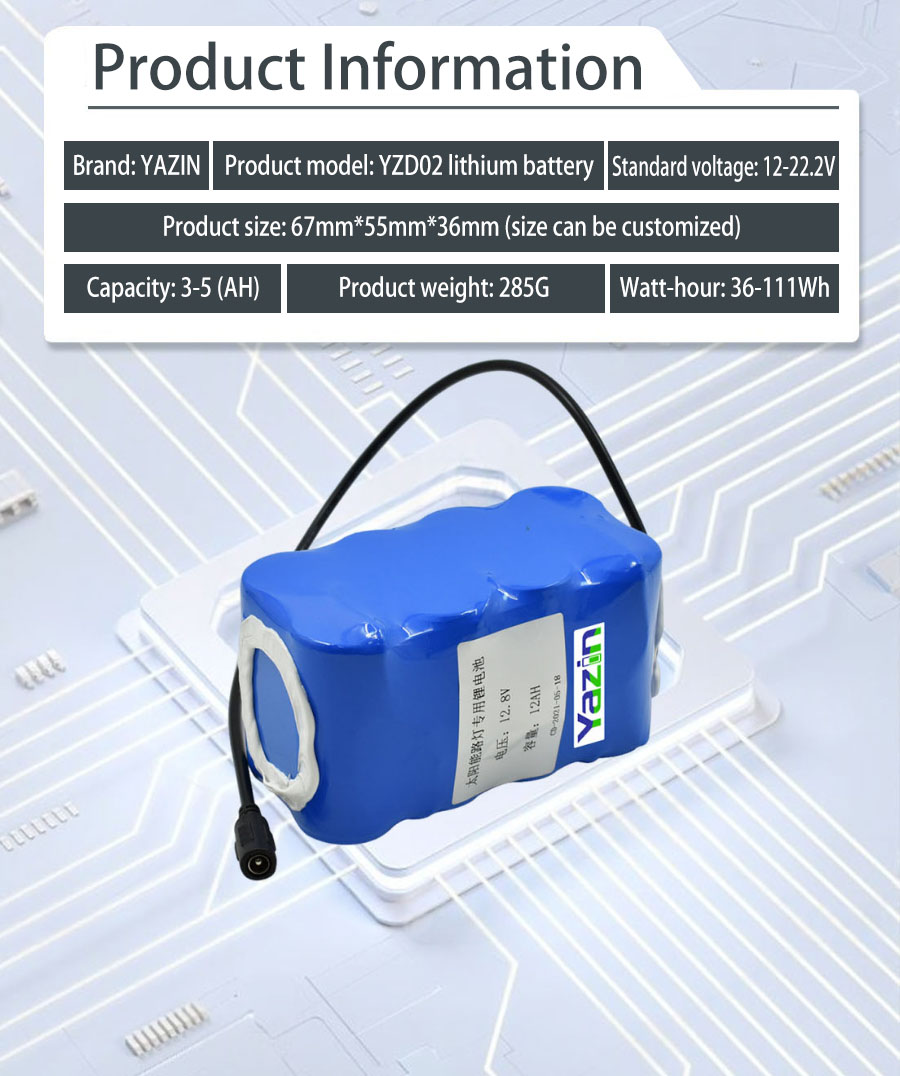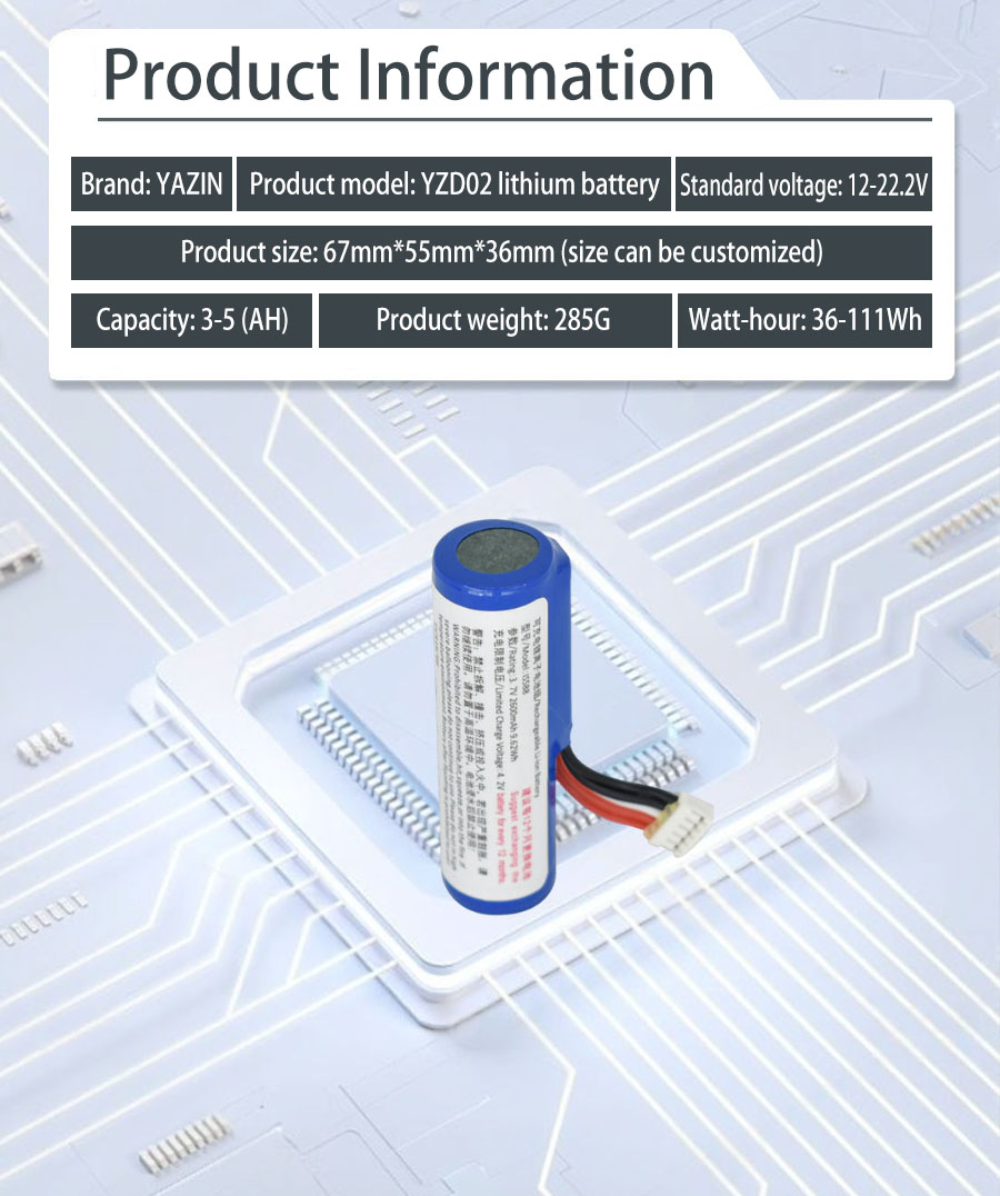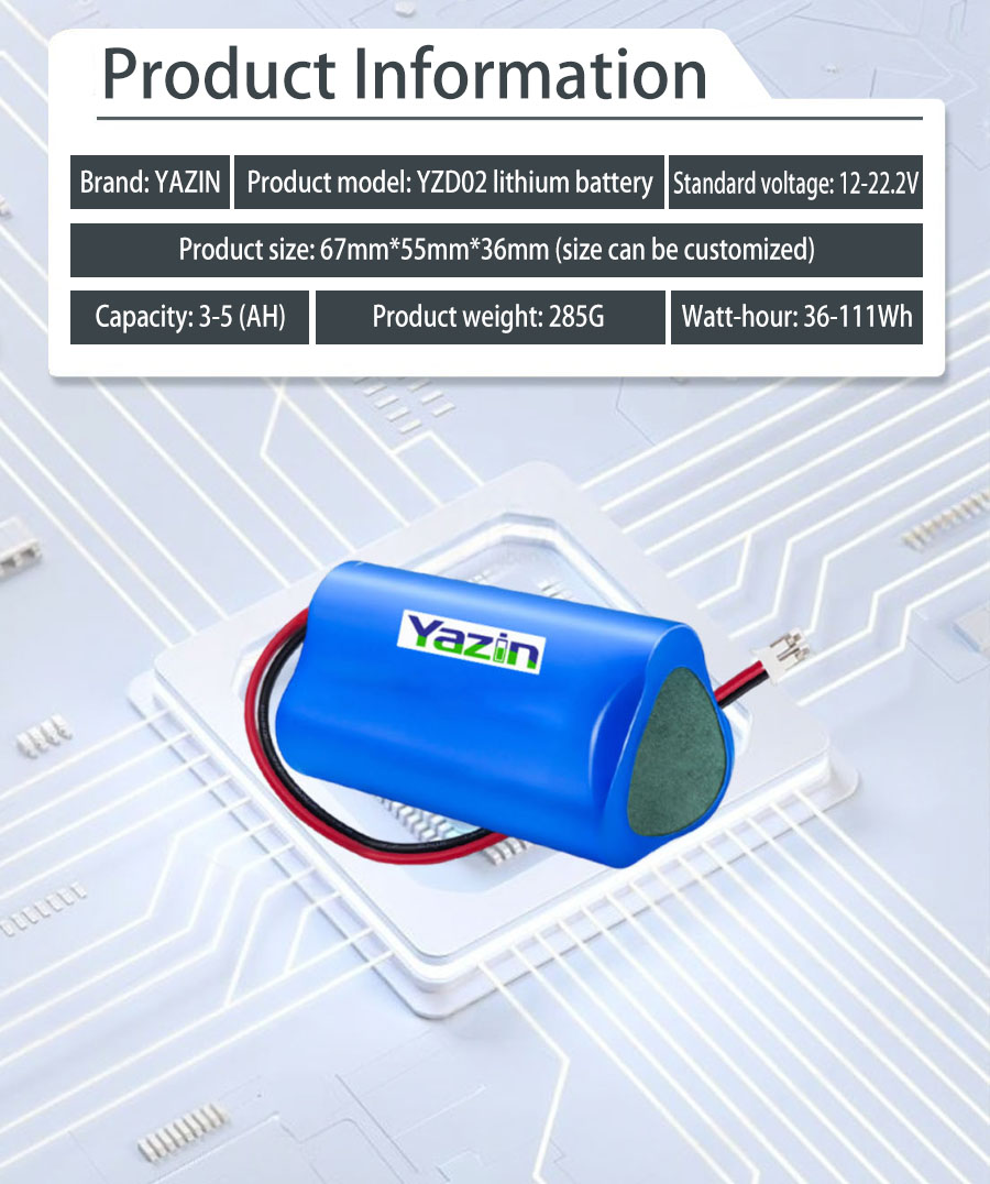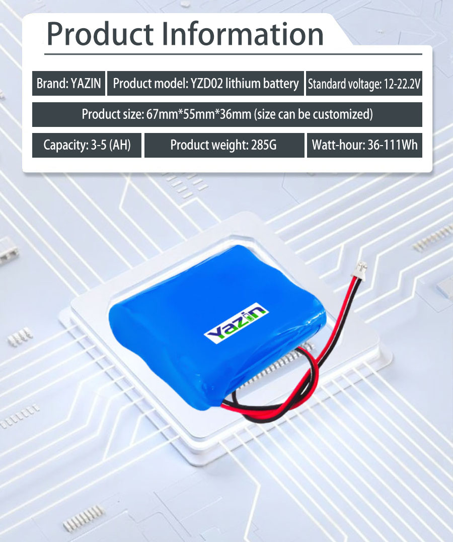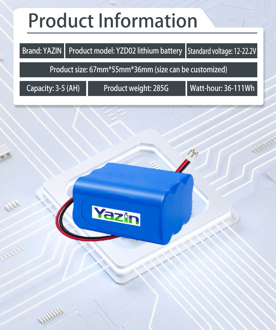 Brand : YAZIN , Product model:YZD02 Lithium Battery , Standard voltage:12V ~22.2V , Capacity:3(AH)~5(AH) , Product size: 67mm*55mm*36mm(Sizes can be customized), Product weight:285g , Watt-hour:36Wh~111Wh
