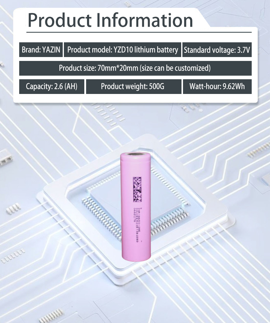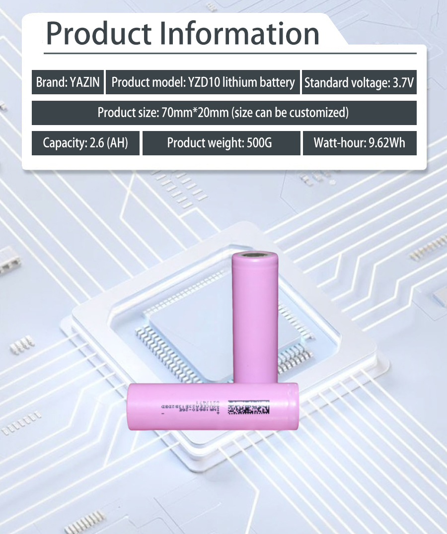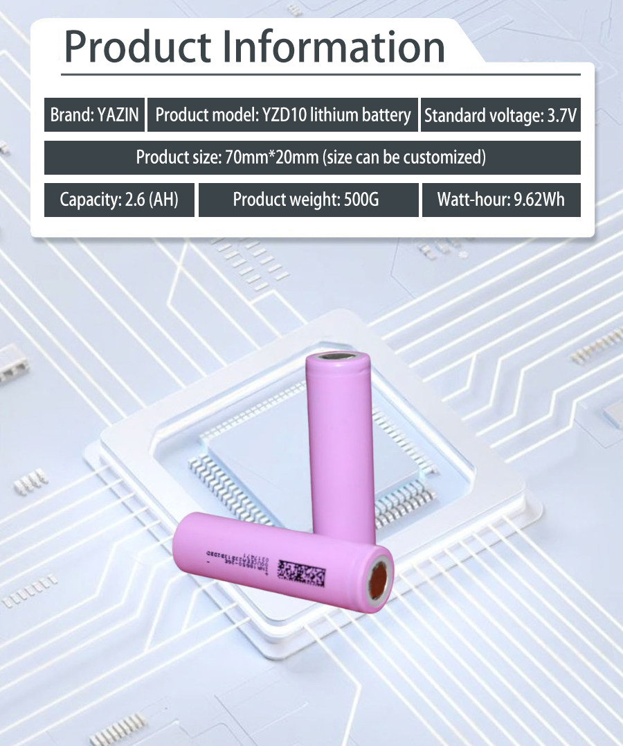 Brand : YAZIN , Product model:YZD10 Lithium battery , Standard voltage:3.7V , Capacity:2.6(AH) , Product size: 70mm*20mm(Size can be customized) , Product weight:500g , Watt-hour:9.62Wh