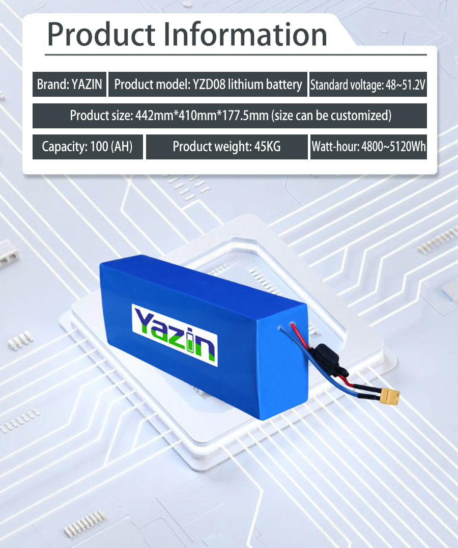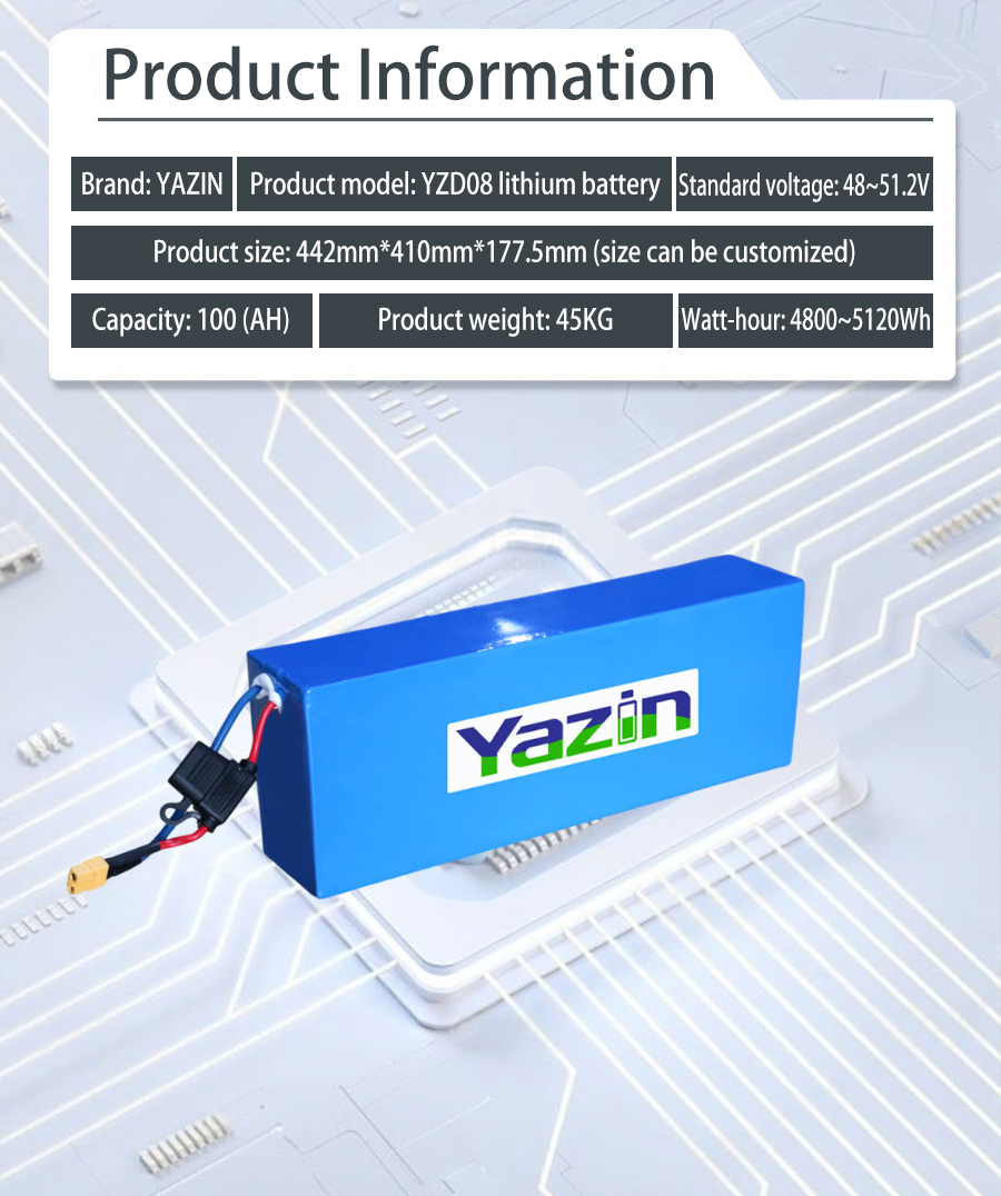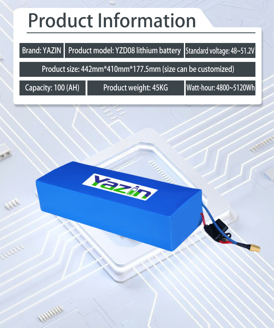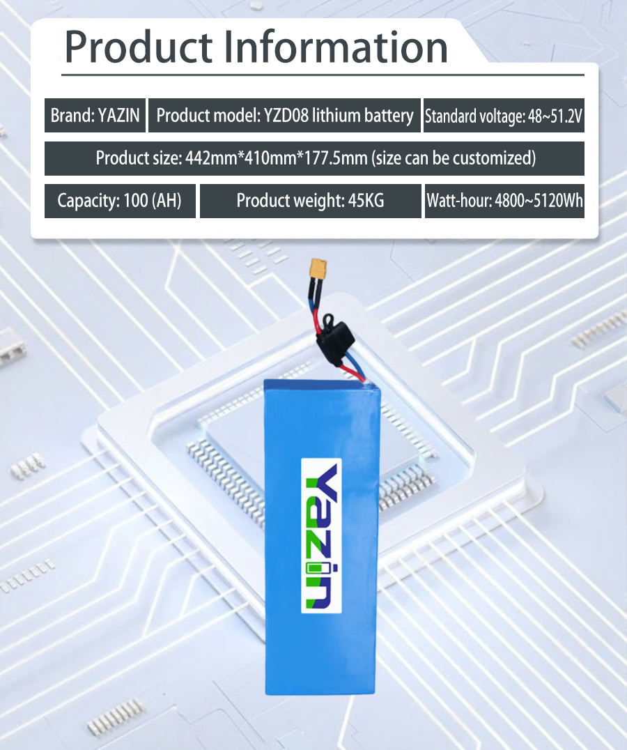 Brand : YAZIN , Product model:YZD08 Lithium battery , Standard voltage:48V ~51.2V , Capacity:100(AH) , Product size: 442mm*410mm*177.5mm(Size can be customized), Product weight:45kg , Watt-hour:4800Wh~5120Wh