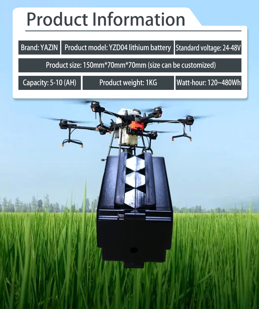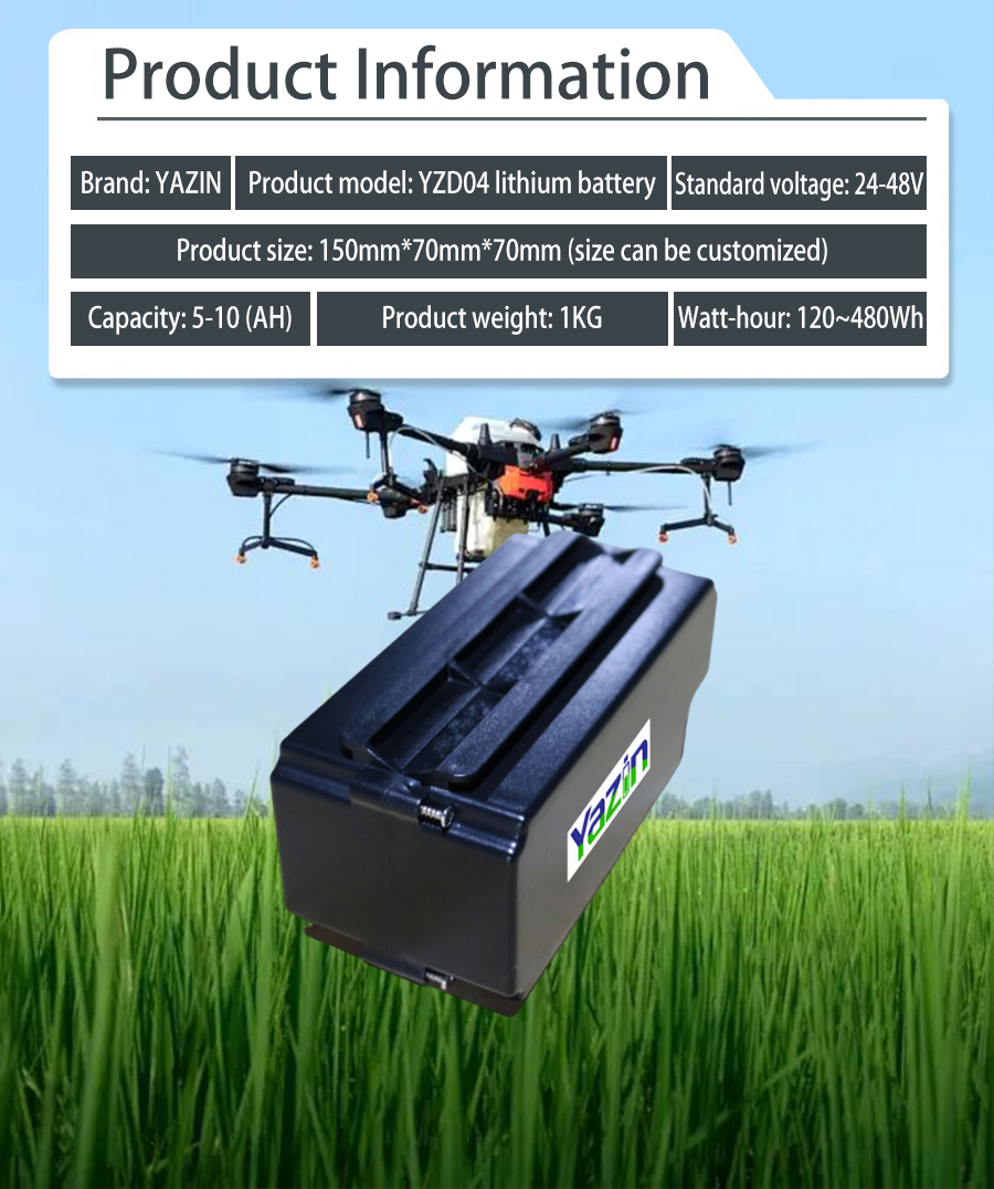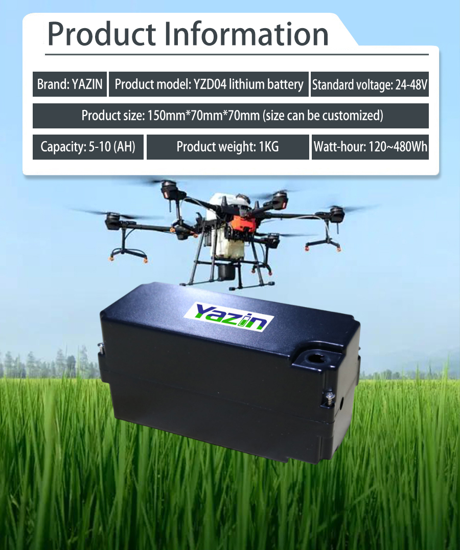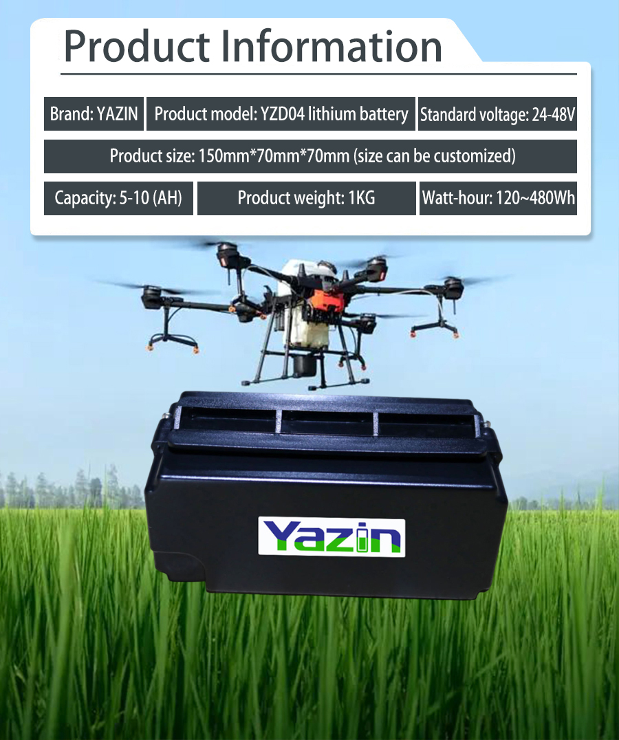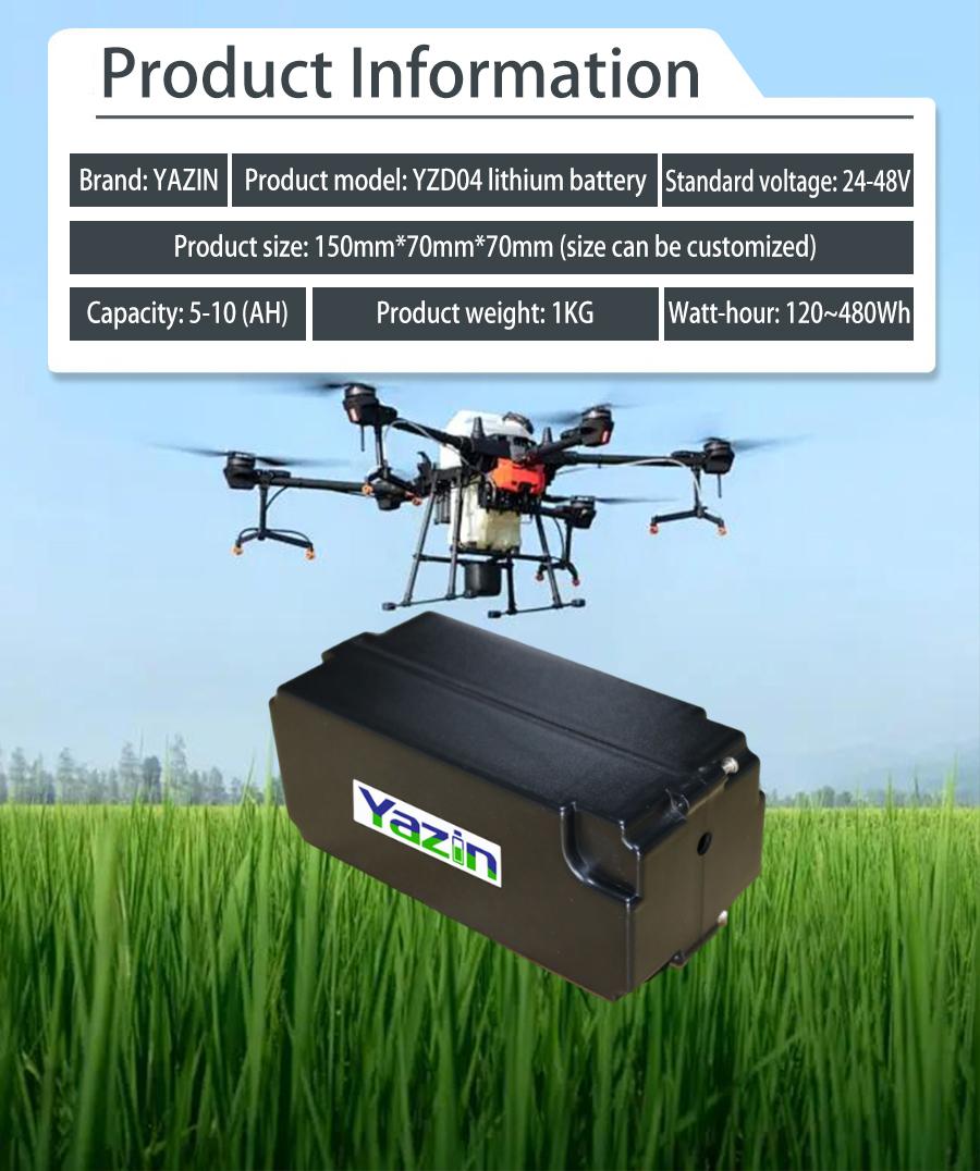 Brand : YAZIN , Product model:YZD04 Lithium battery , Standard voltage:24V~48V , Capacity:5(AH)~10(AH) , Product size: 150mm*70mm*70mm(Size can be customized), Product weight:1kg , Watt-hour:120Wh~480Wh