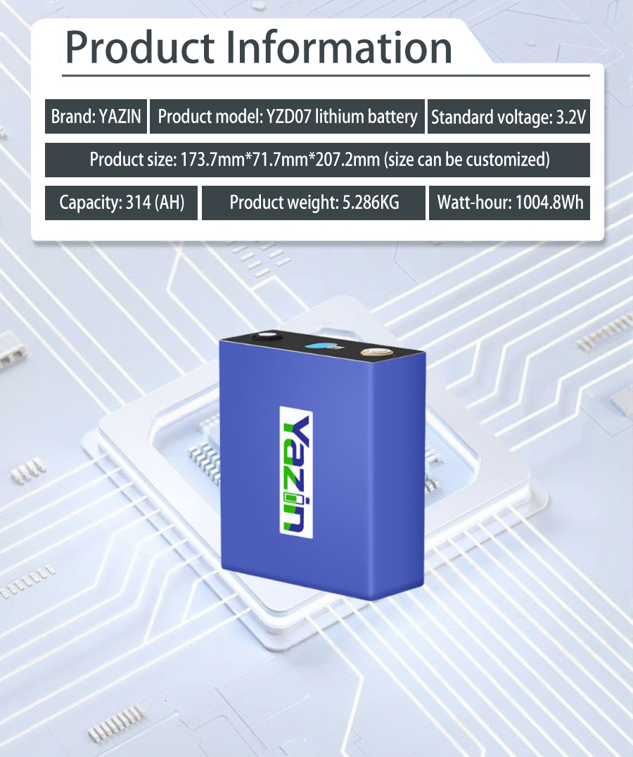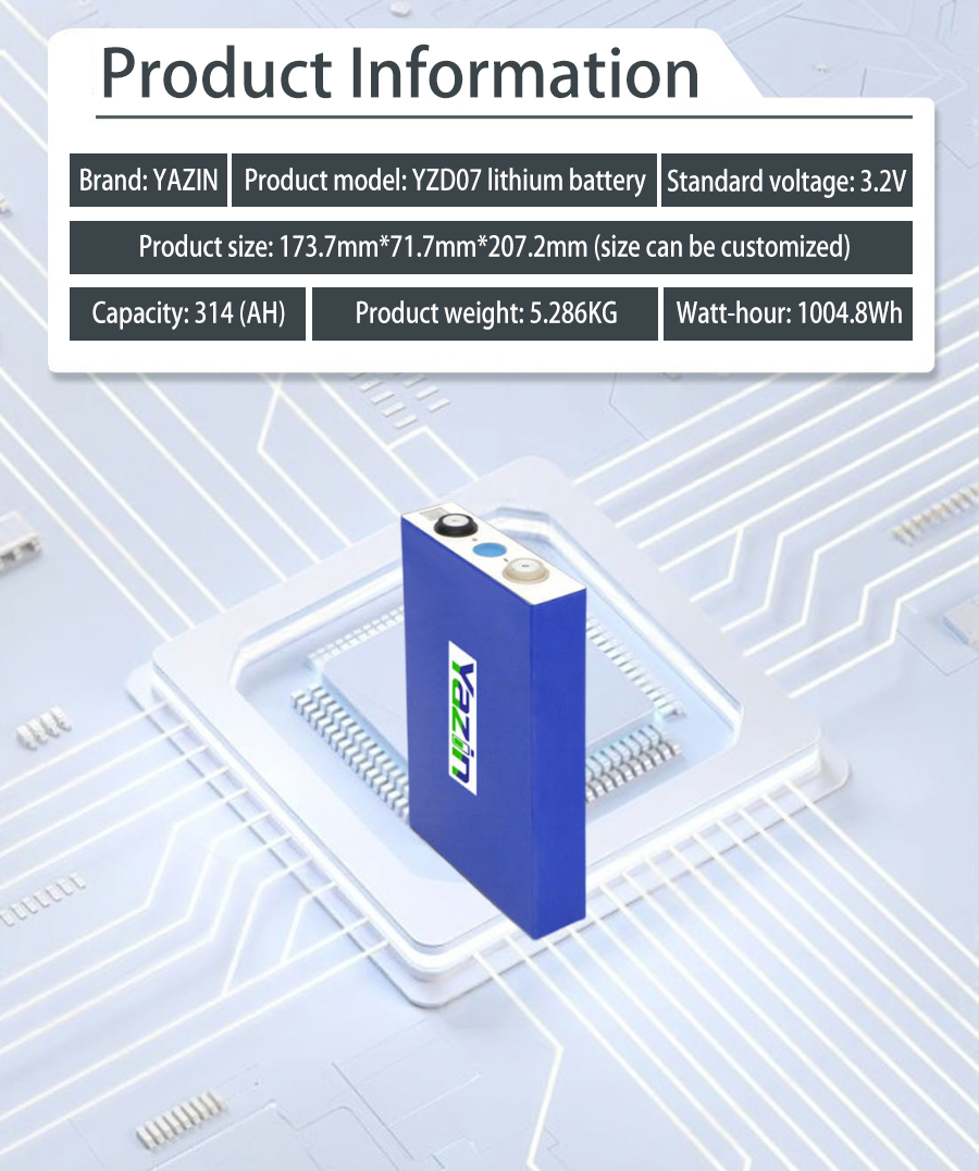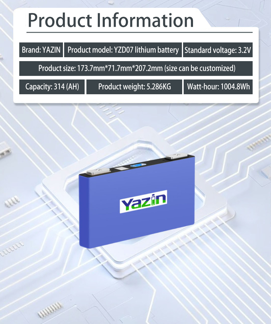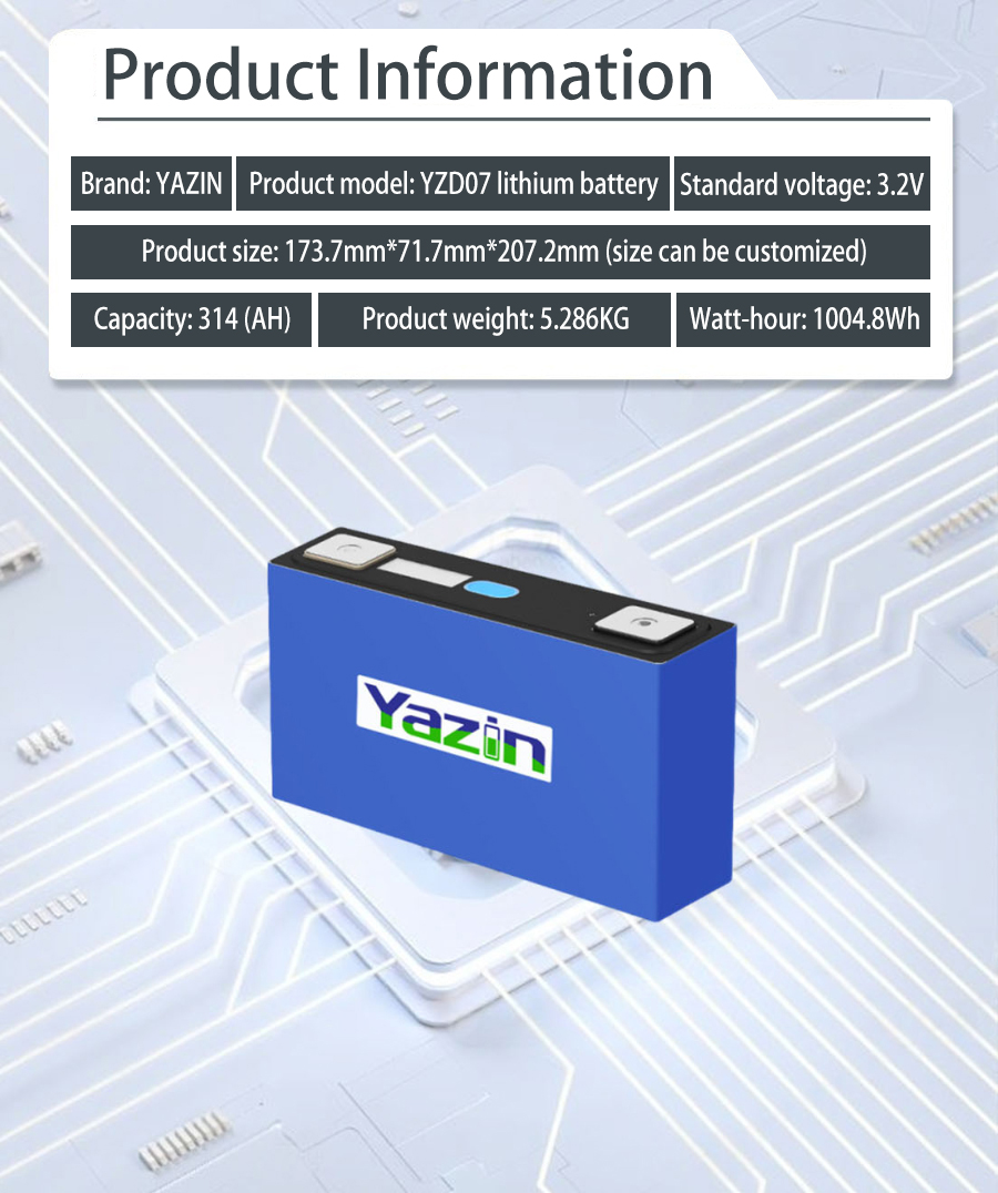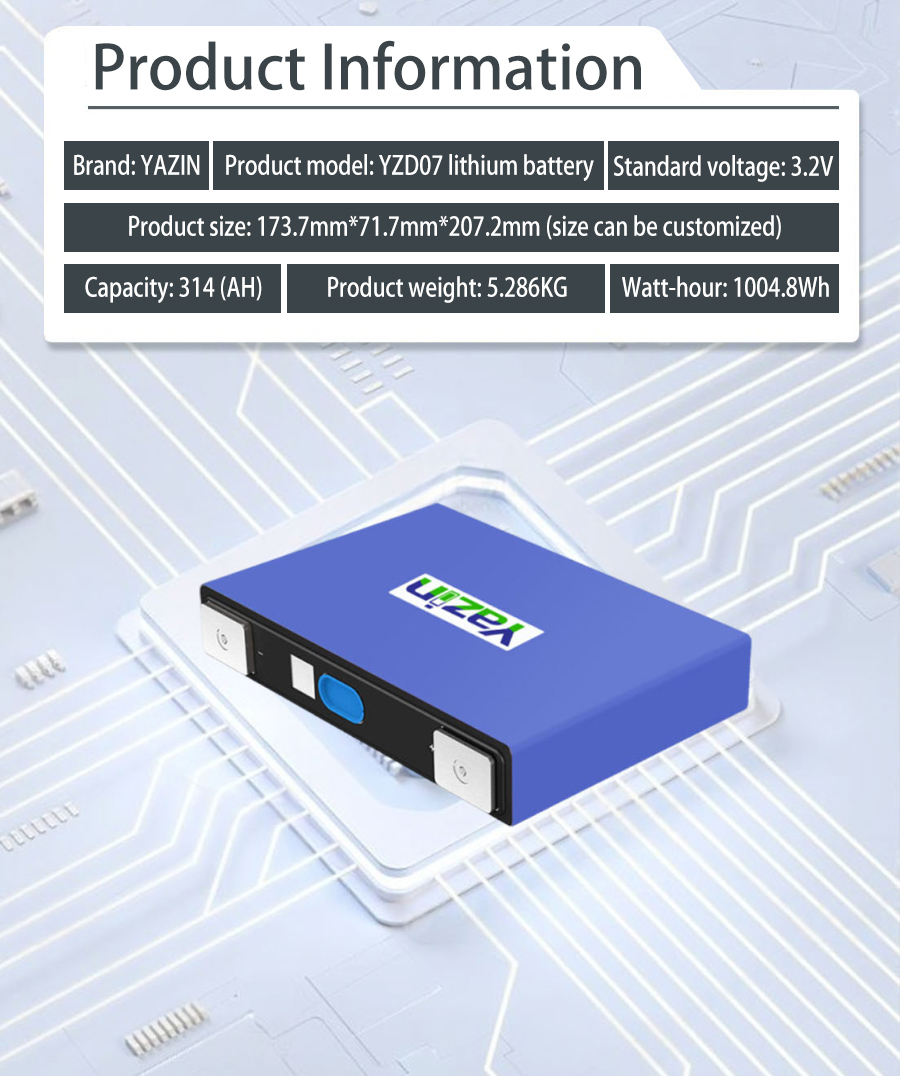 Brand : YAZIN , Product model:YZD07 Lithium battery , Standard voltage:3.2V , Capacity:314(AH) , Product size: 173.7mm*71.7mm*207.2mm(Size can be customized) Product weight:5.286KG , Watt-hour:1004.8Wh