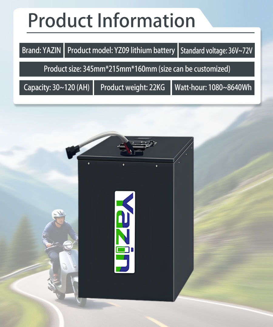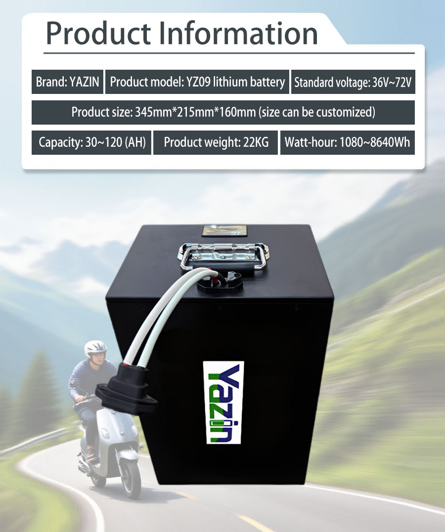 Brand : YAZIN , Product model:YZ09 Lithium battery , Standard voltage:36V~72V , Capacity:30(AH)~120(AH) , Product size: 345mm*215mm*160mm(Sizes can be customized), Product weight:22kg , Watt-hour:1080~8640W