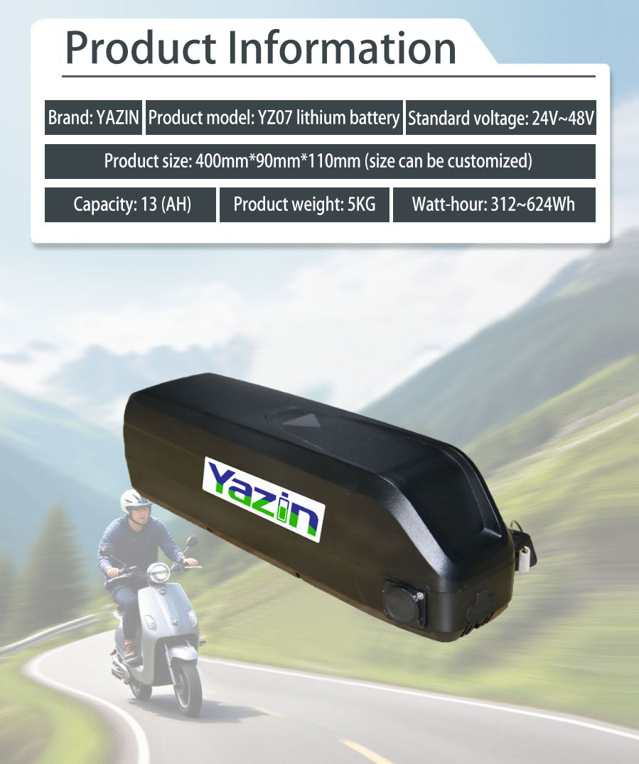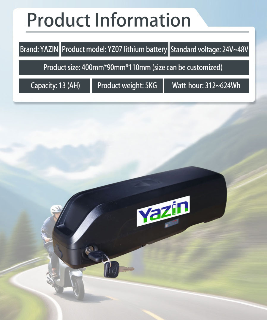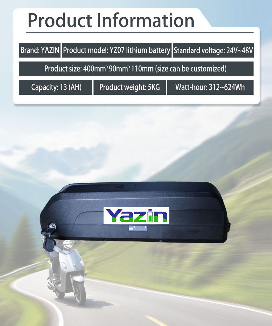 Brand : YAZIN , Product model:YZ07 Lithium Battery , Standard voltage:24V-48V , Capacity:13(AH) , Product size: 400mm*90mm*110mm(Size can be customized), Product weight:5kg , Watt-hour:312Wh~624Wh