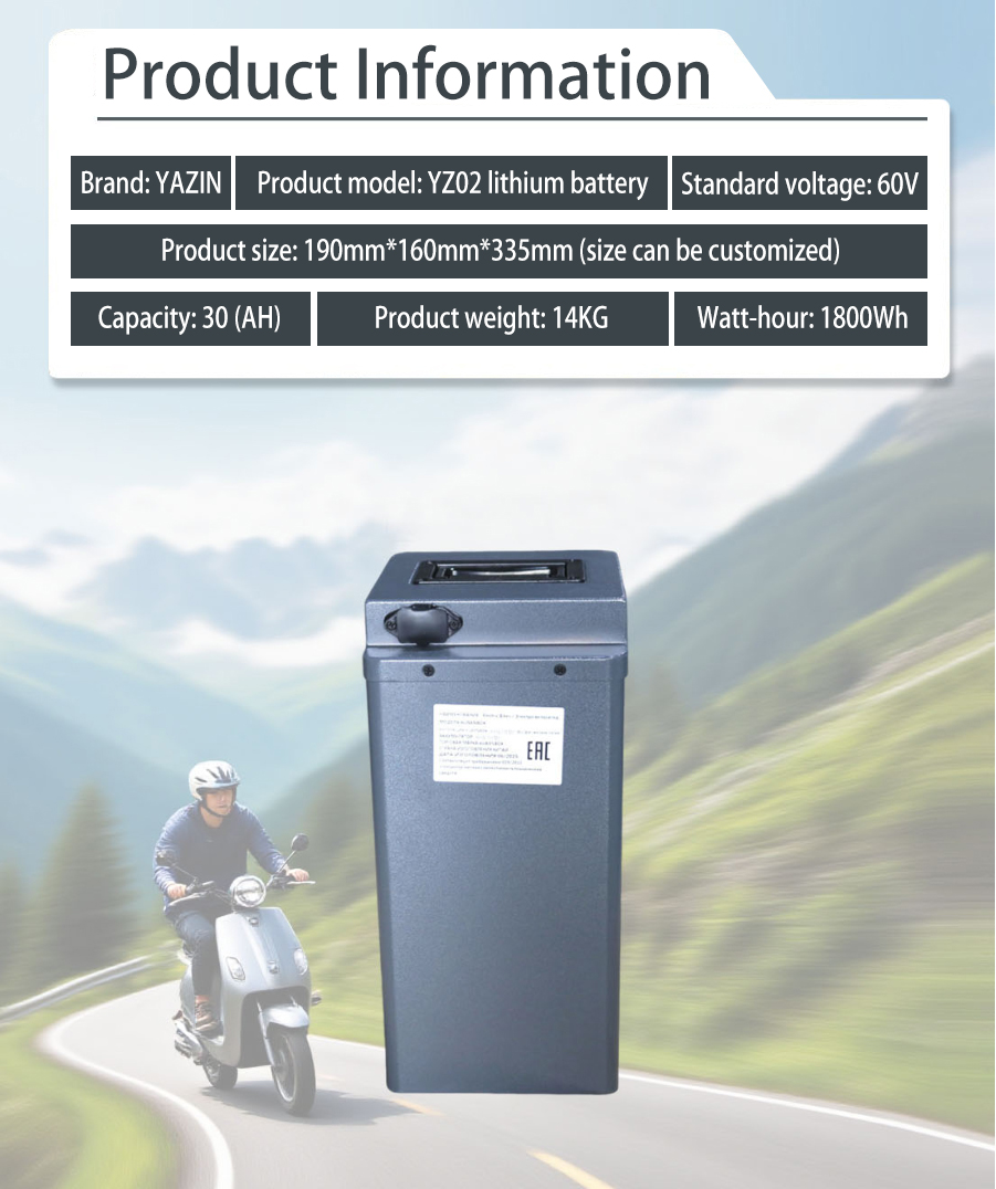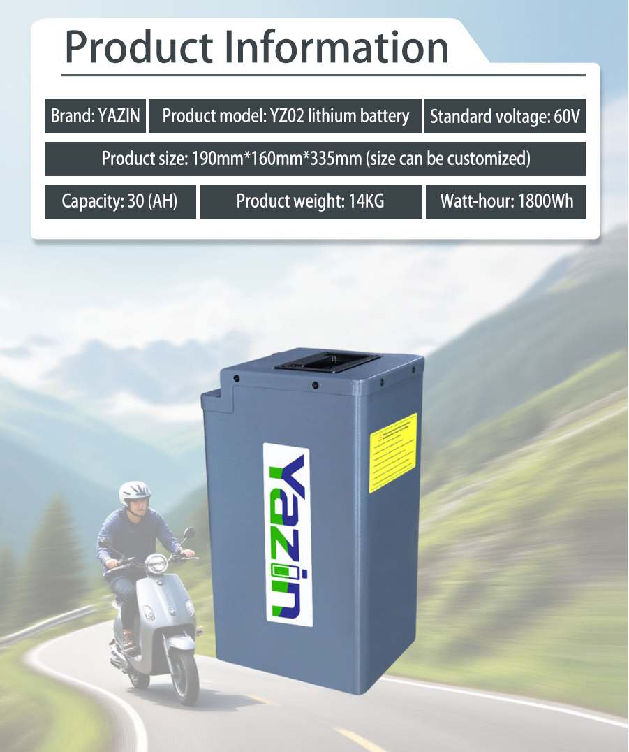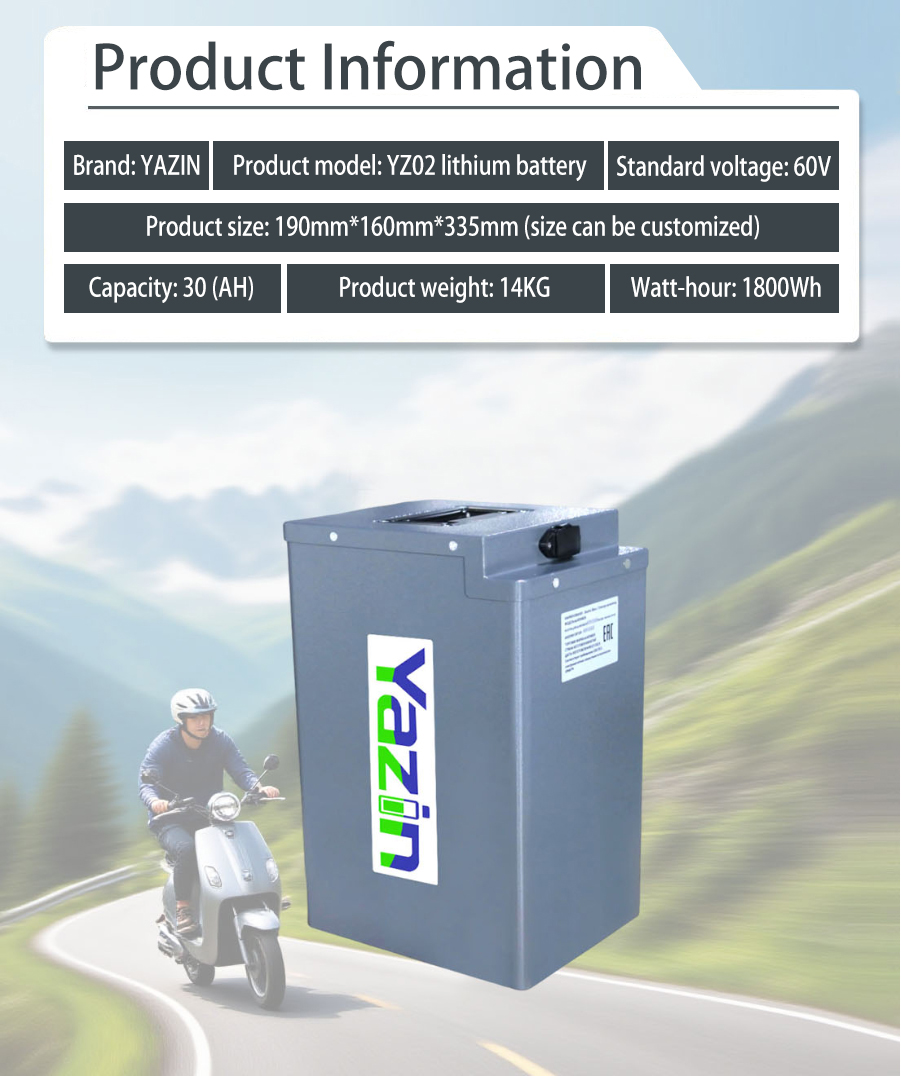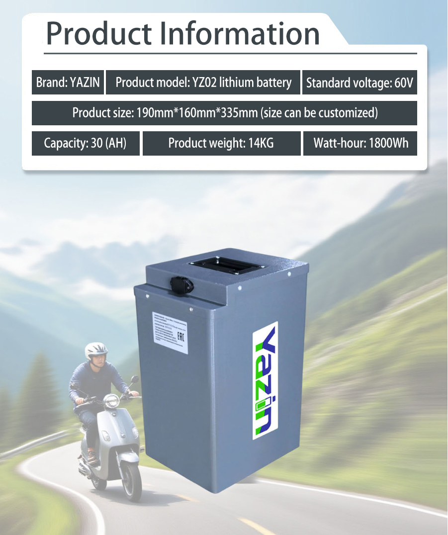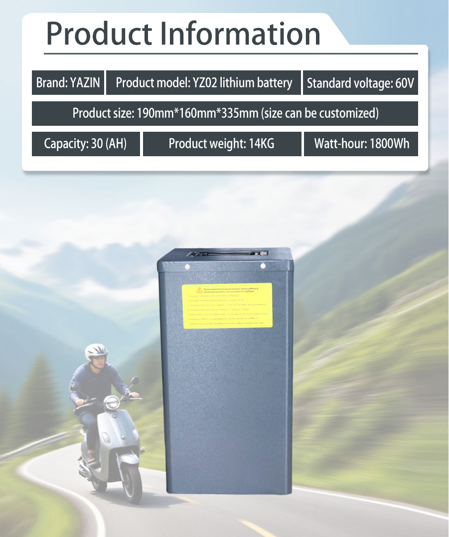 Brand : YAZIN , Product model:YZ02 Lithium Battery , Standard Voltage:60V , Capacity:30(AH) , Product Size: 190mm*160mm*335mm(Size can be customized), Product weight:14kg , Watt-hour:1800Wh