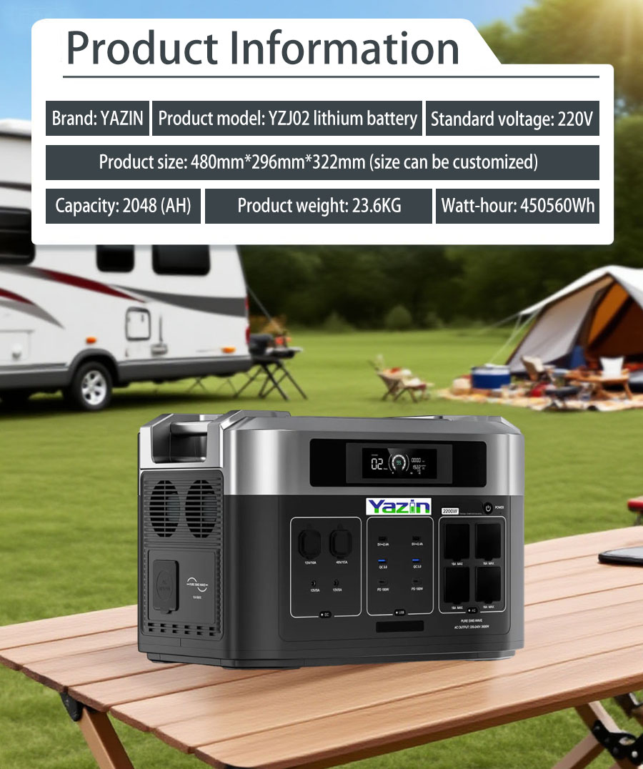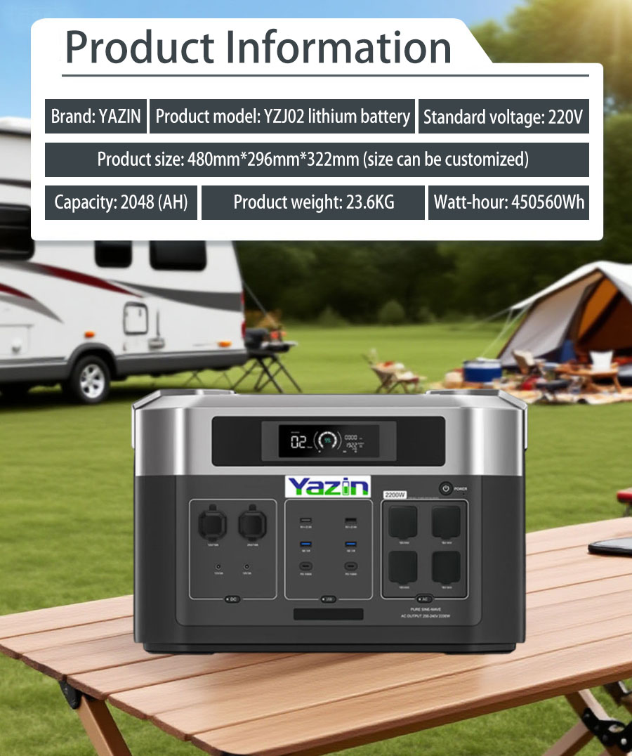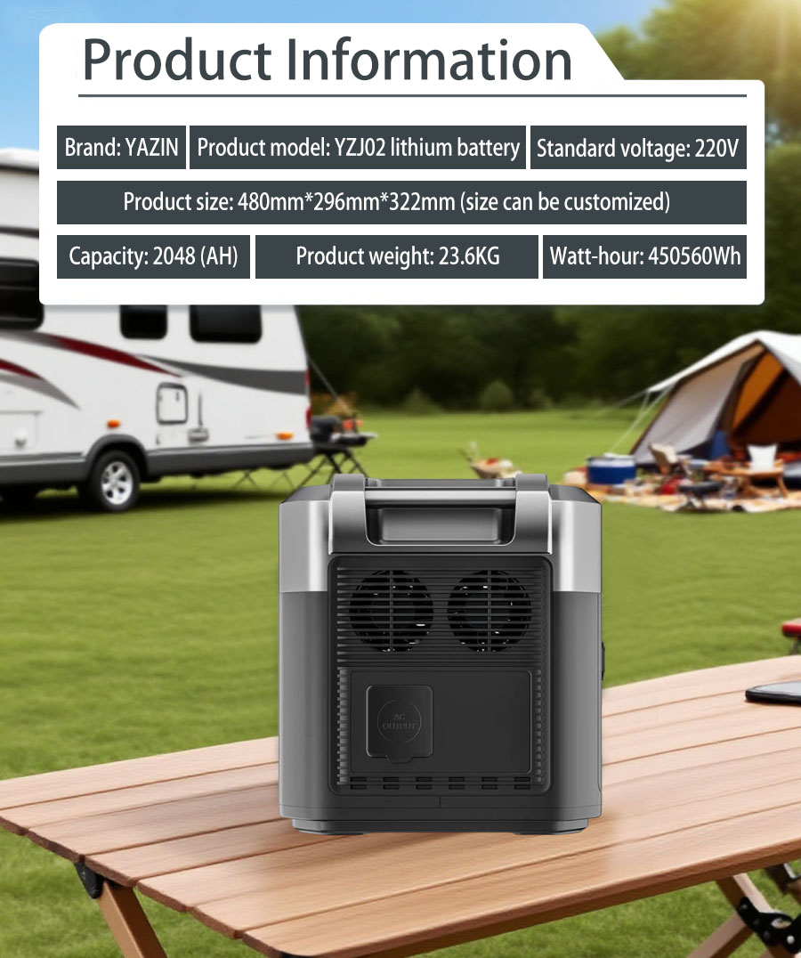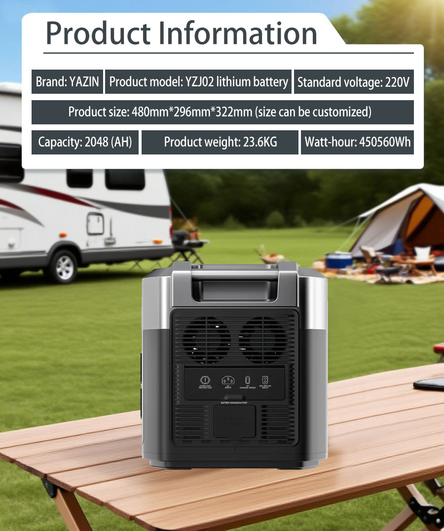 Brand : YAZIN , Product model:YZJ02 Lithium battery , Standard voltage:220V , Capacity:2048(AH) , Product size: 480mm*296mm*322mm(Sizes can be customized), Product weight:23.6KG , Watt-hour:450560Wh