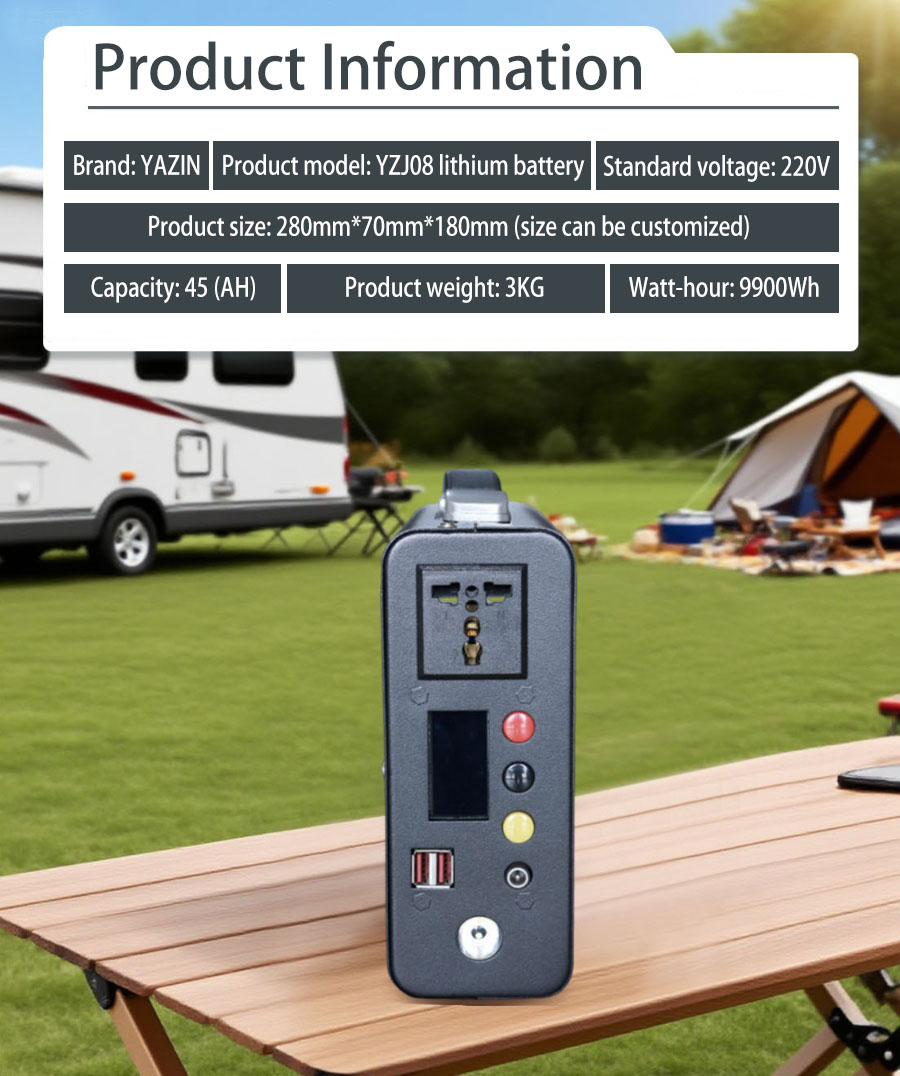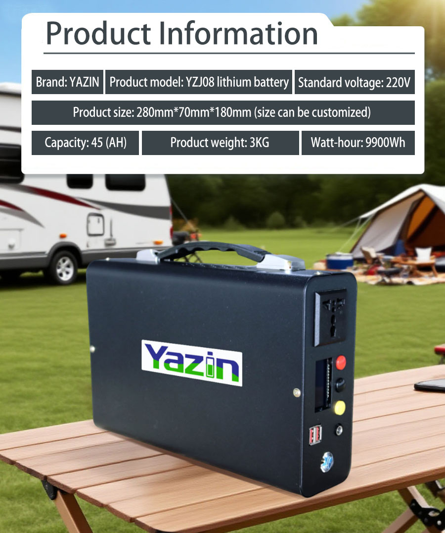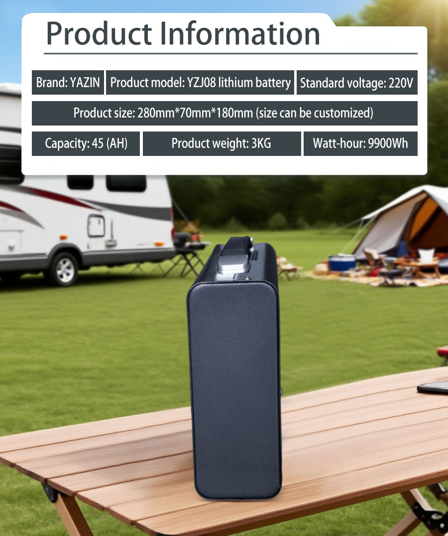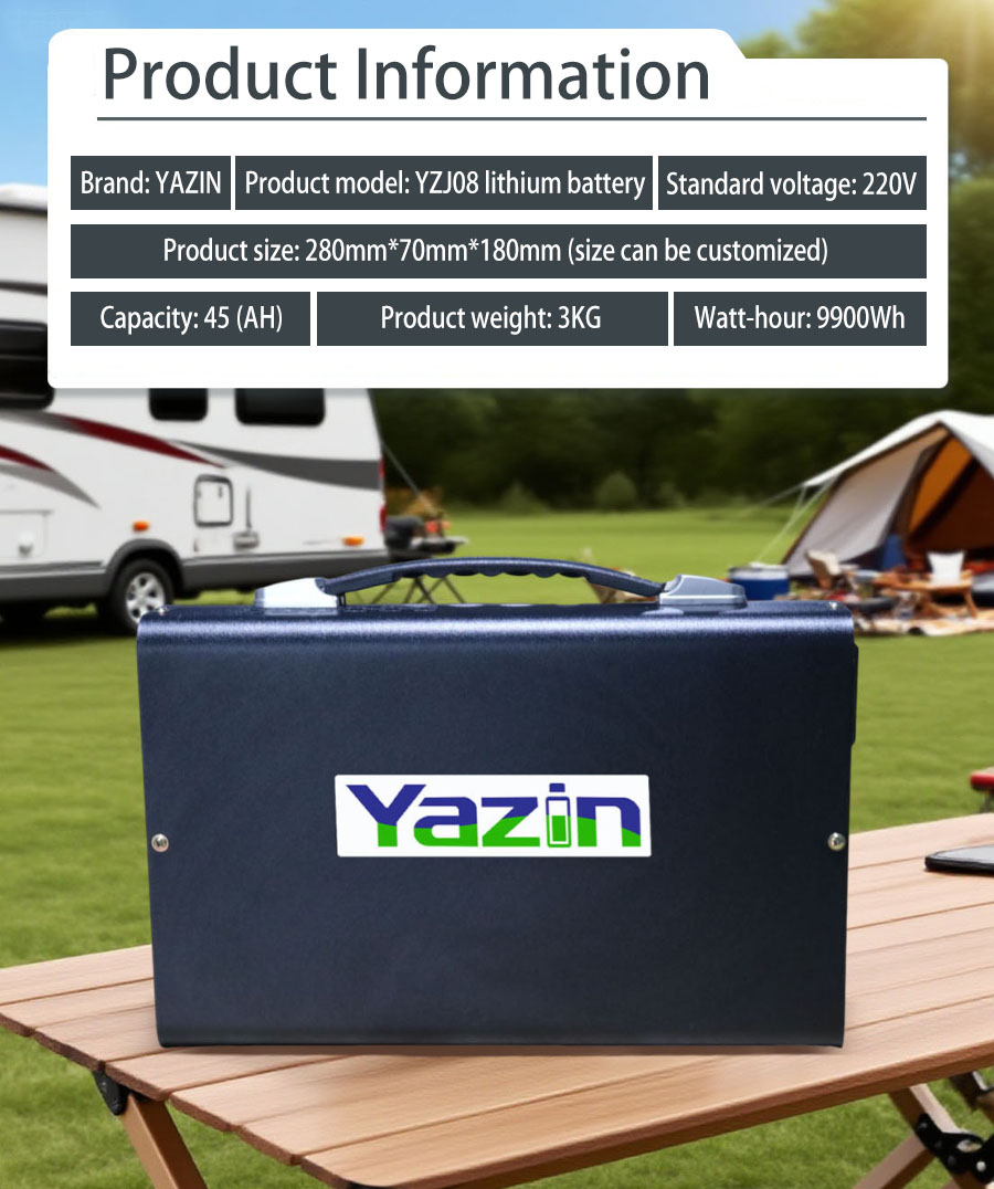 Brand : YAZIN , Product model:YZJ08 Lithium battery , Standard voltage:220V , Capacity:45(AH) , Product size: 280mm*70mm*180mm(Size can be customized), Product weight:3kg , Watt-hour:9900Wh