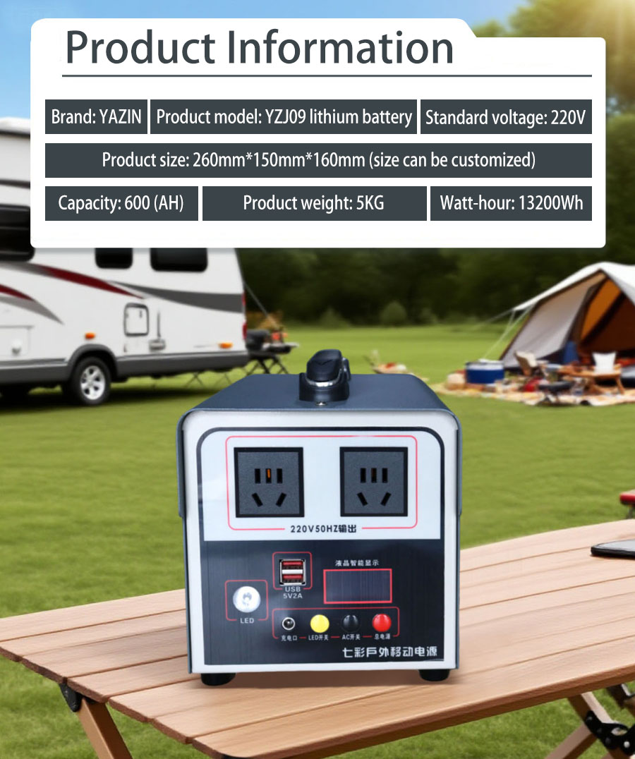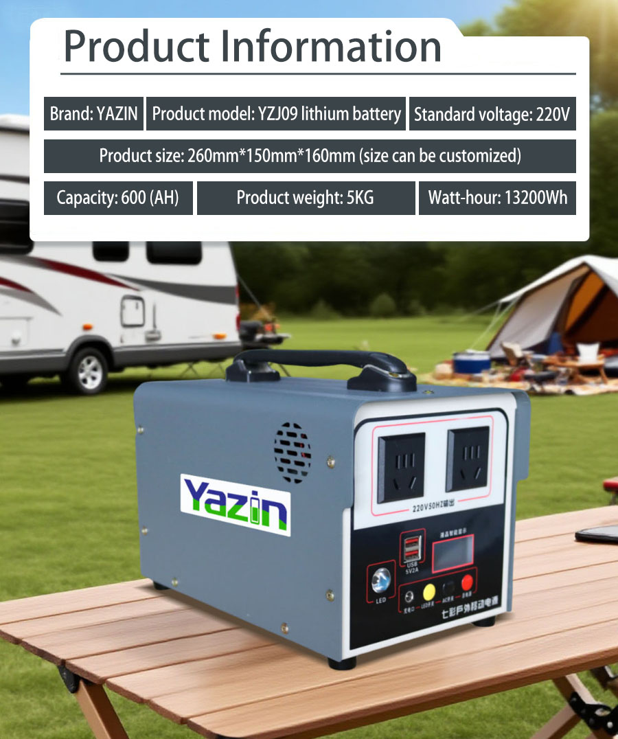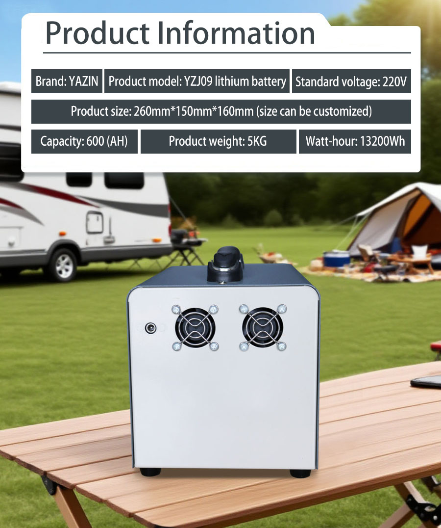 Brand : YAZIN , Product model:YZJ09 Lithium battery , Standard voltage:220V , Capacity:600(AH) , Product size: 260mm*150mm*160mm(Size can be customized), Product weight:5kg , Watt-hour:13200Wh