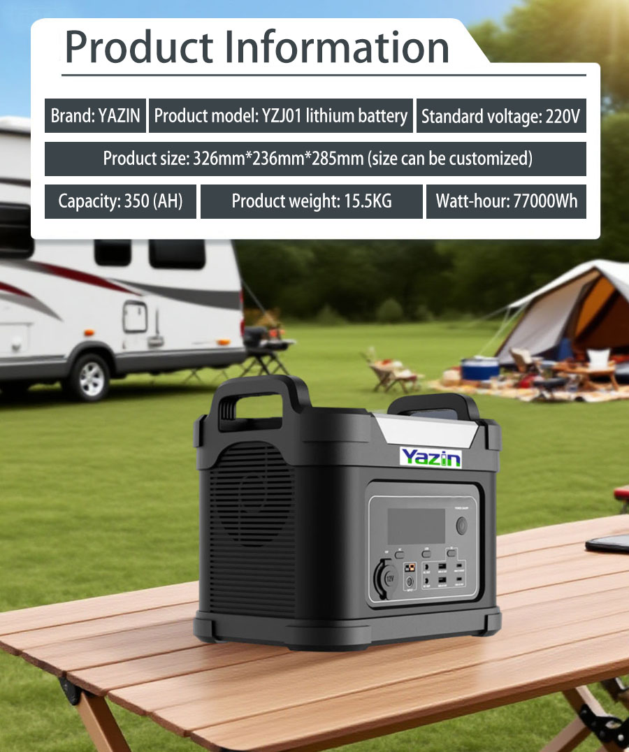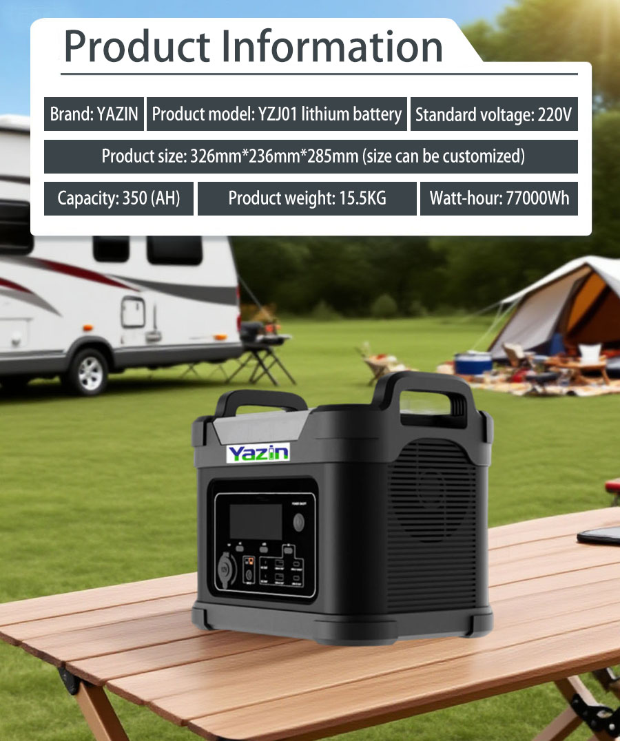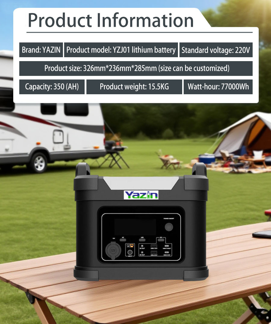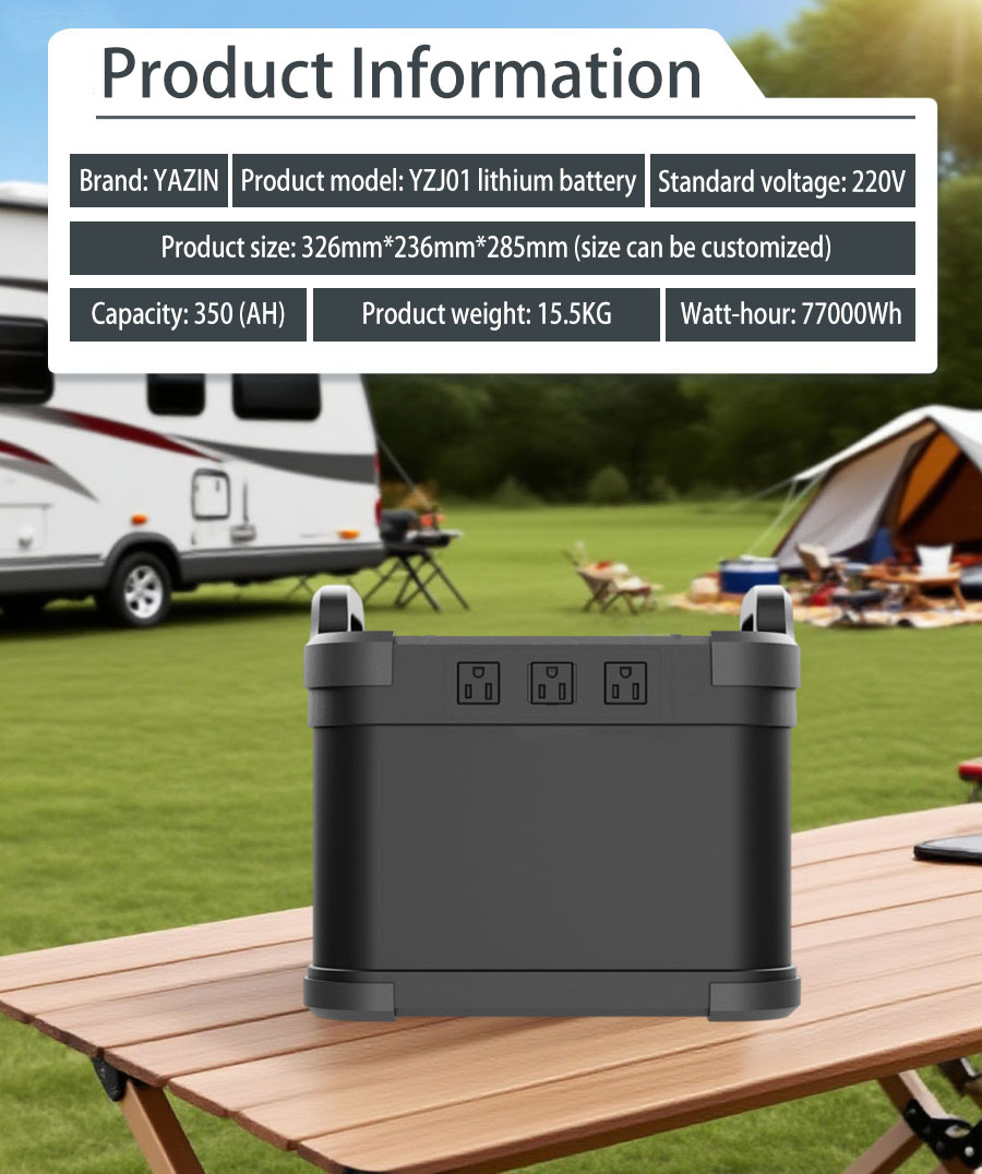 Brand : YAZIN , Product model:YZJ01 Lithium battery , Standard voltage:220V , Capacity:350(AH) , Product size: 326mm*236mm*285mm(Size can be customized), Product weight:15.5KG , Watt-hour:77000Wh