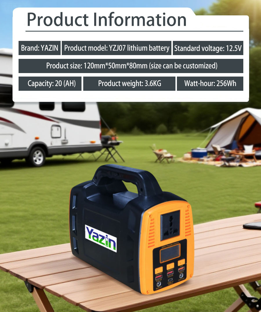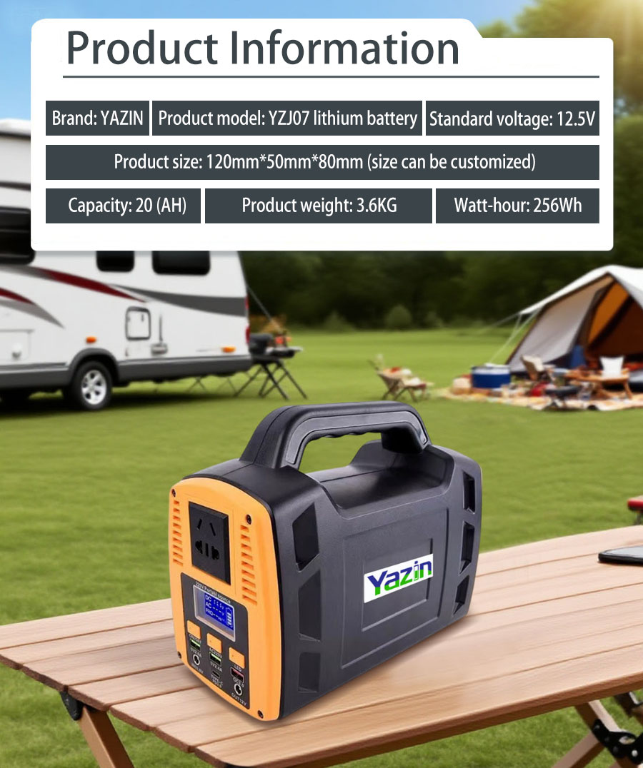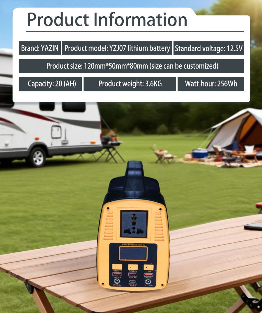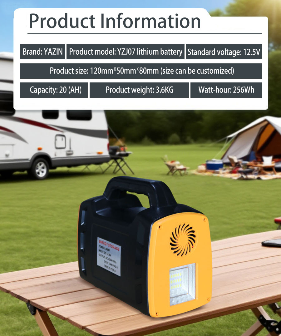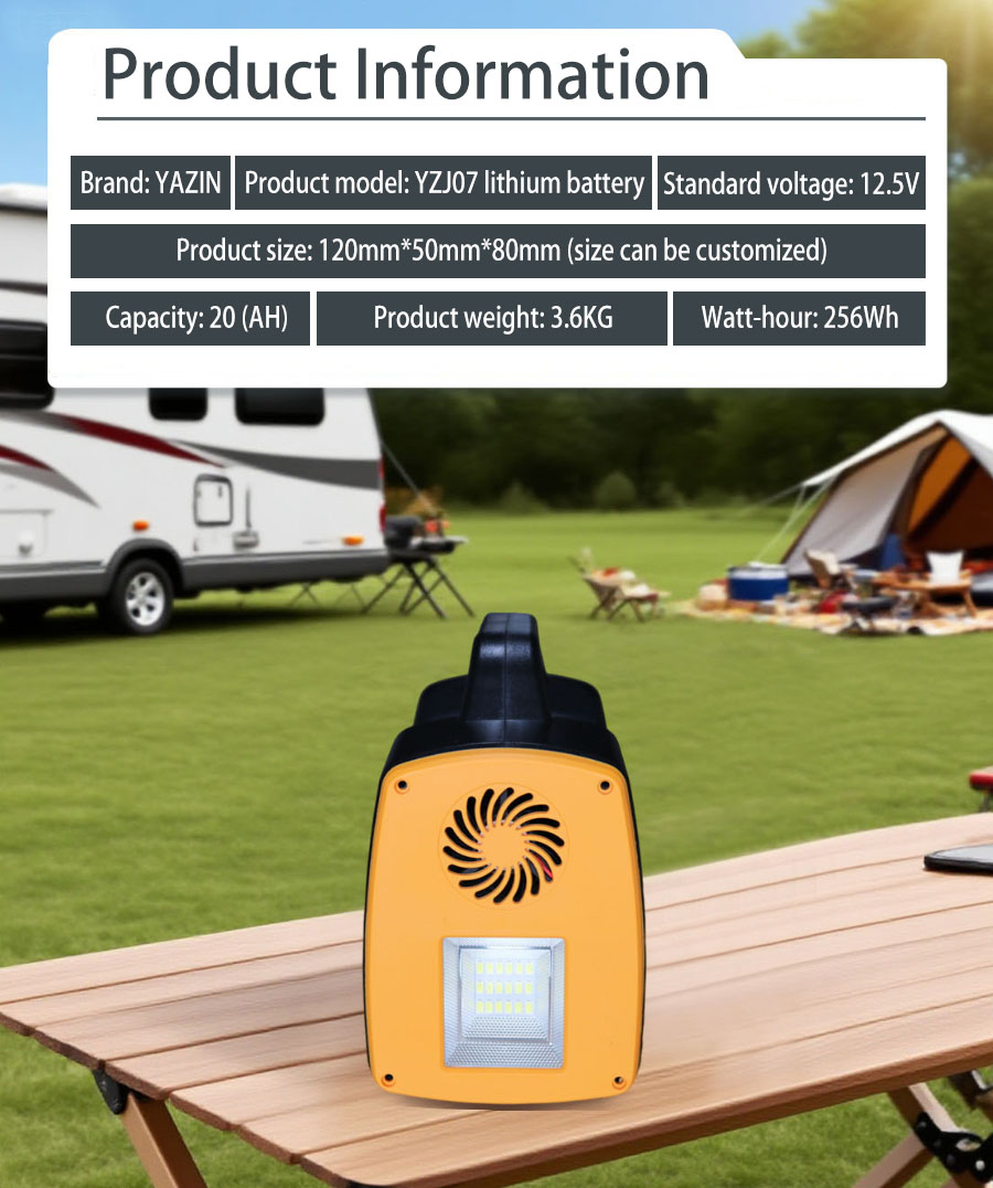Brand : YAZIN , Product model:YZJ07 Lithium battery , Standard voltage:12.5V , Capacity:20(AH) , Product size: 120mm*50mm*80mm(Size can be customized), Product weight:3.6kg , Watt-hour:256Wh