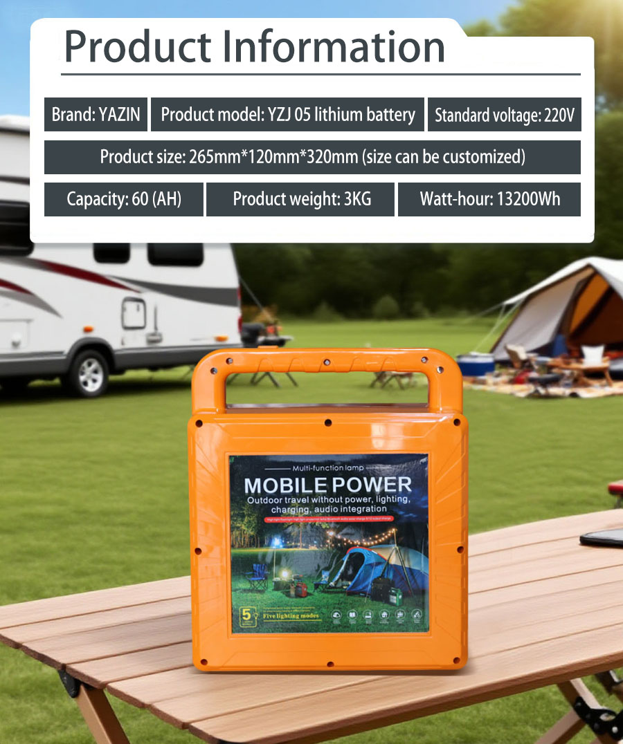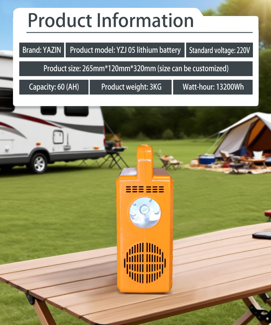 Brand : YAZIN , Product model:YZJ05 Lithium battery , Standard voltage:220V , Capacity:60(AH) , Product size: 265mm*120mm*320mm(Sizes can be customized), Product weight:3kg , Watt-hour:13200Wh