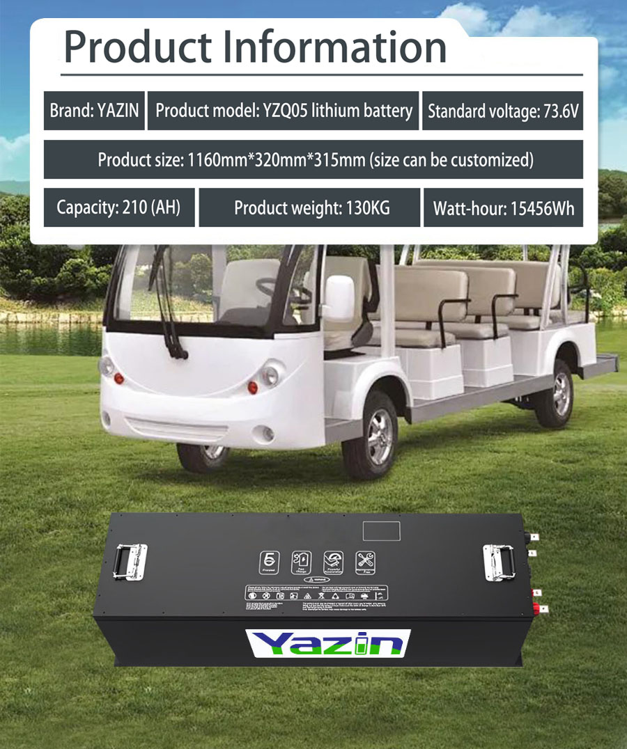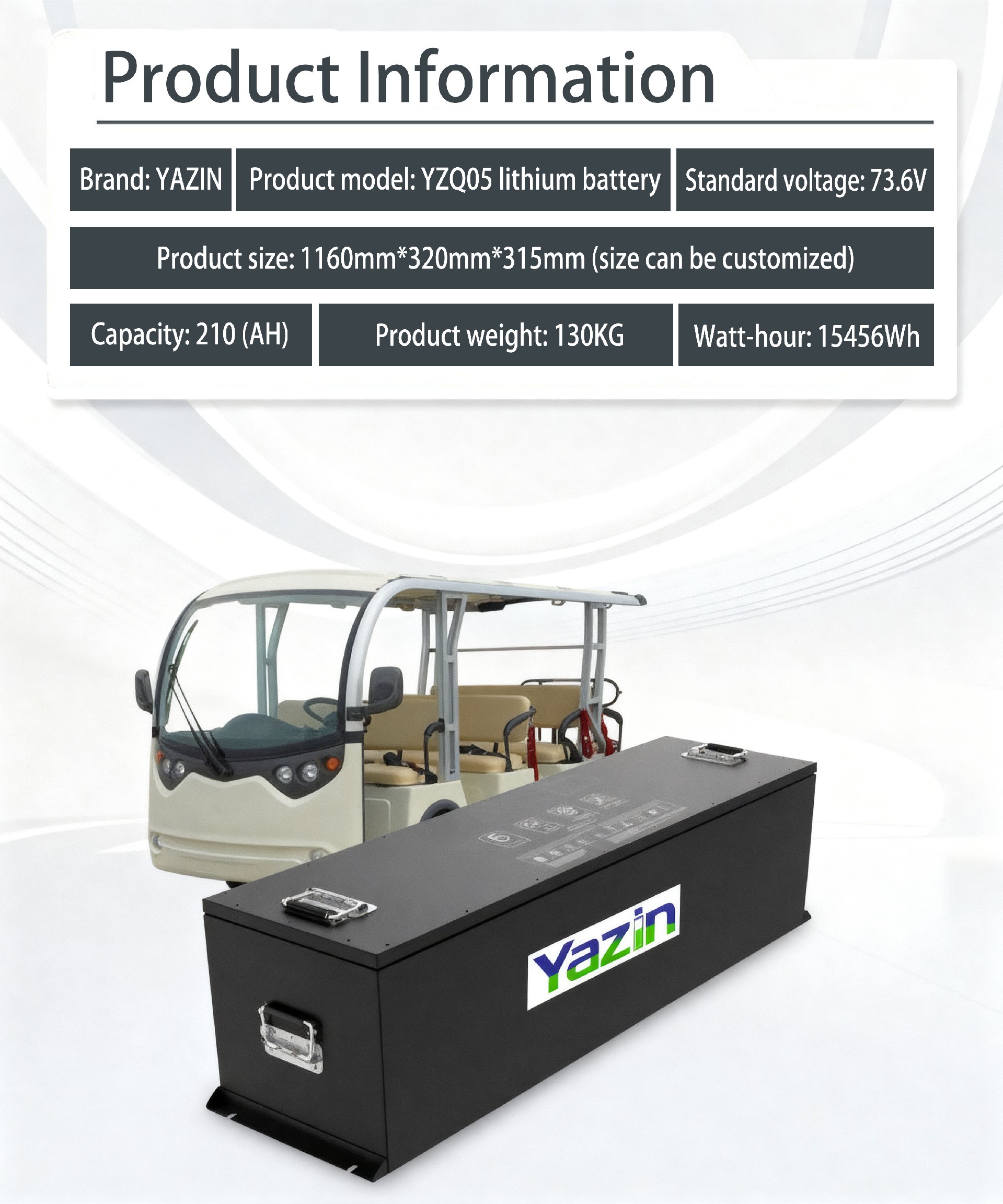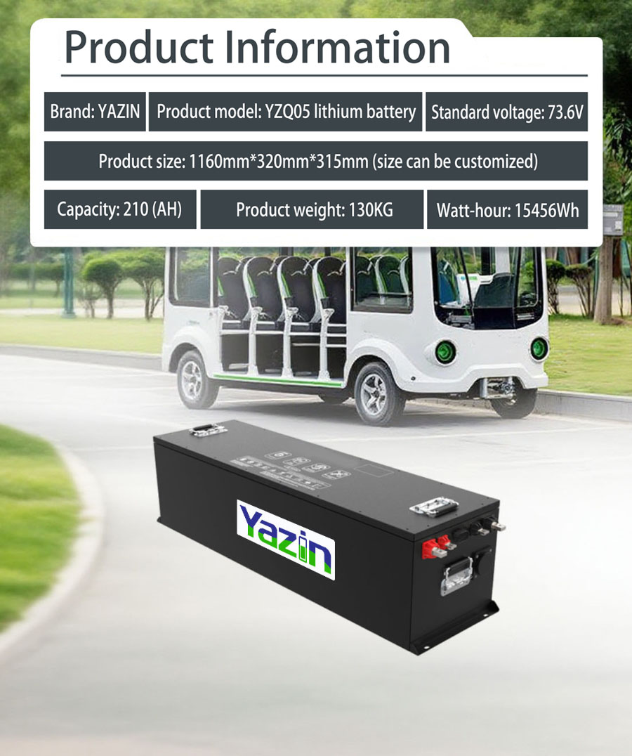 Brand : YAZIN , Product model:YZQ05 Lithium battery , Standard voltage:73.6V , Capacity:210(AH) , Product size: 1160mm*320mm*315mm(Size can be customized), Product weight:130kg , Watt-hour:15456Wh