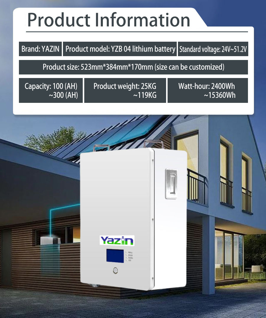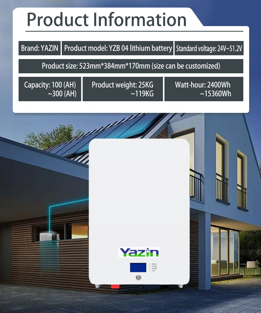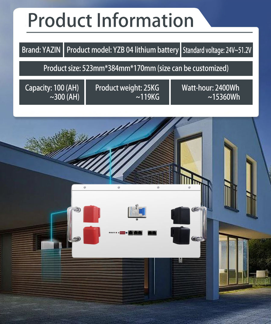 Brand : YAZIN , Product model:YZB04 Lithium battery , Standard voltage:24V~51.2V , Capacity:100(AH)~300(AH) , Product size: 523mm*384mm*170mm(Size can be customized), Product weight:25kg~119kg , Watt-hour:2400Wh~15360Wh