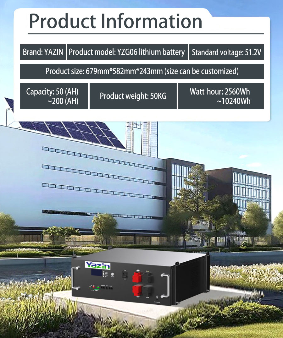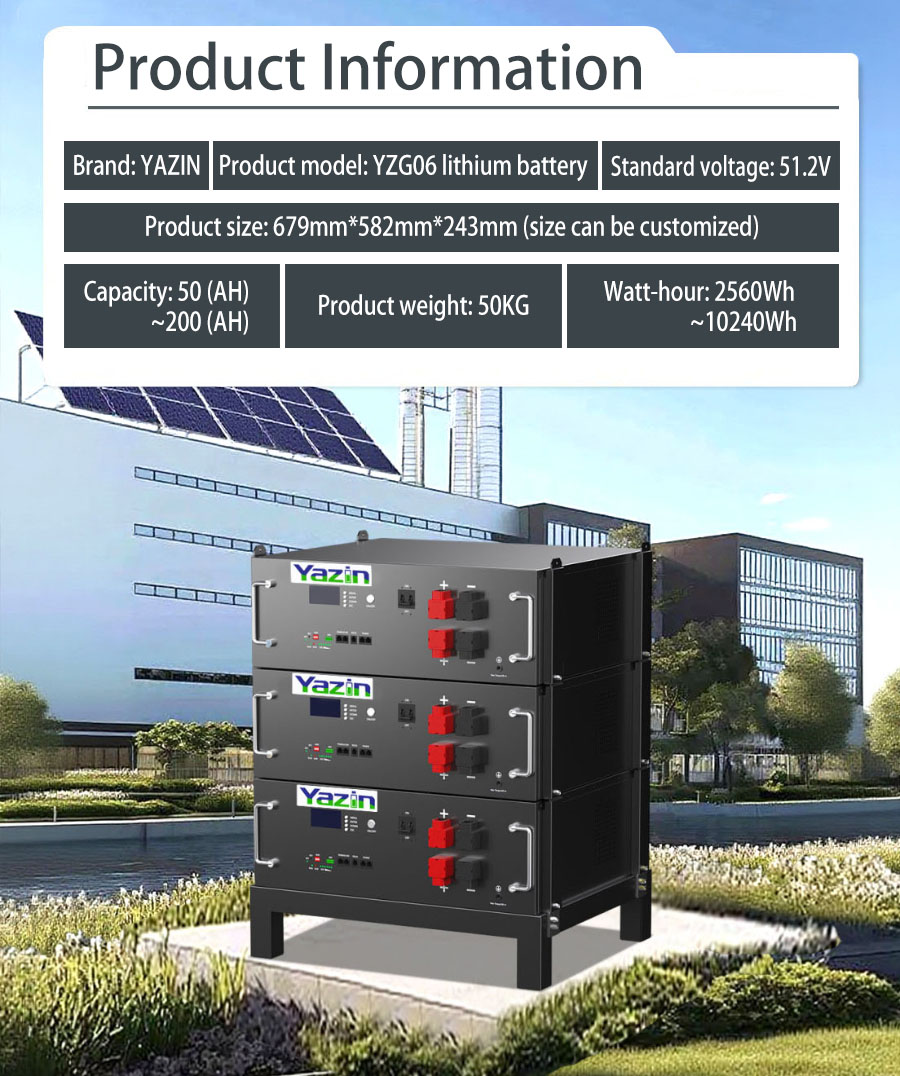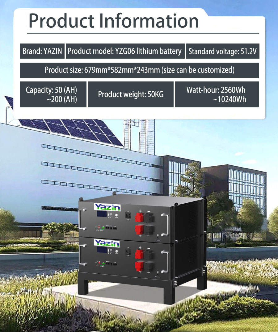 Brand : YAZIN , Product model:YZG06 Lithium battery , Standard voltage:51.2V , Capacity:50(AH)~200(AH) , Product size: 679mm*582mm*243mm(Size can be customized), Product weight:50kg , Watt-hour:2560Wh~10240Wh