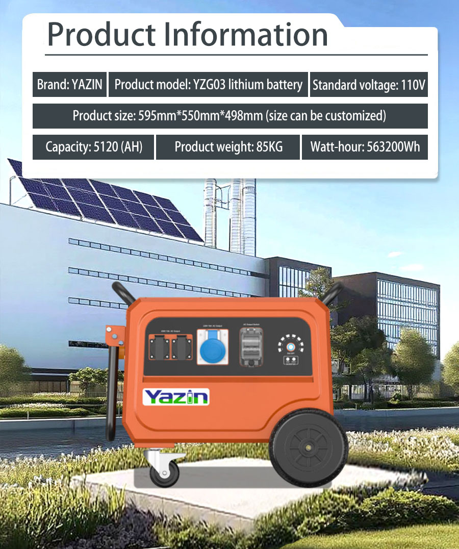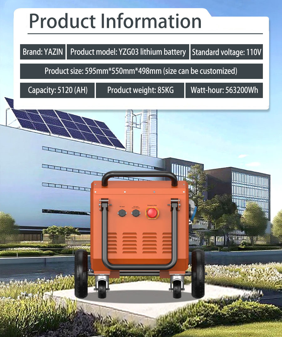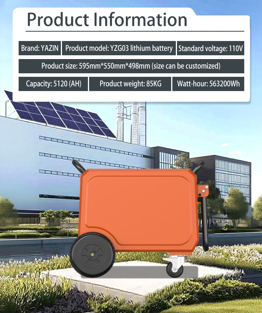 Brand : YAZIN , Product model:YZG03 Lithium battery , Standard voltage:110V , Capacity:5120(AH) , Product size: 595mm*550mm*498mm(Size can be customized), Product weight:85kg , Watt-hour:563200Wh