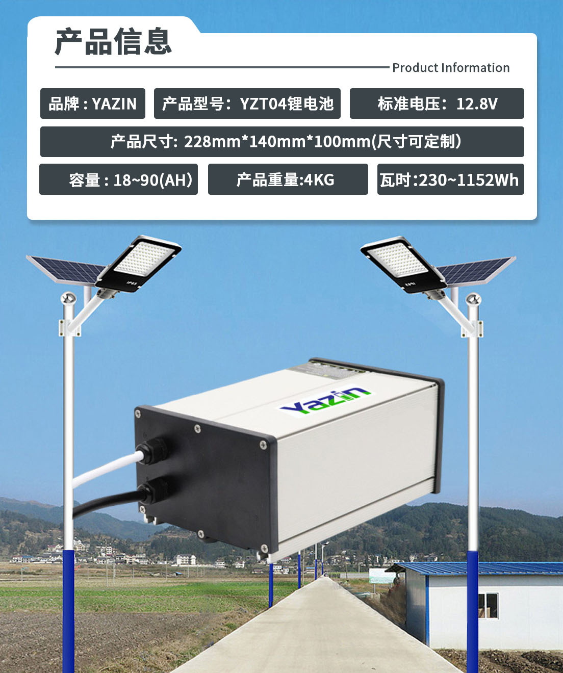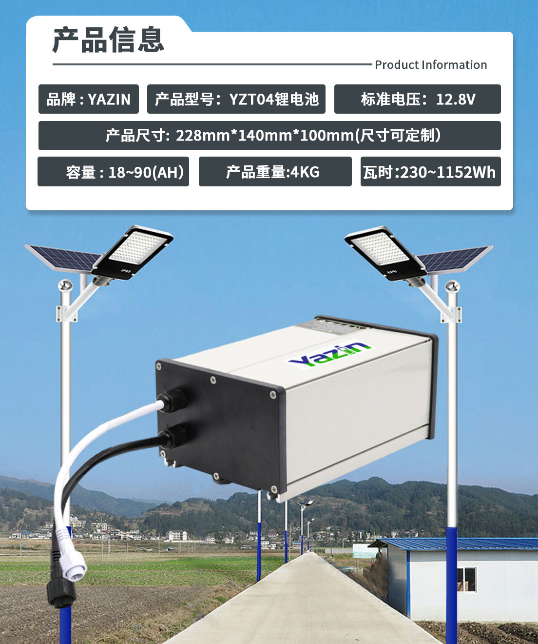 品牌 : YAZIN 产品型号:YZT04锂电池 标准电压:12.8V 额定容量:18(AH)~90(AH)尺寸: 228mm*140mm*100mm(尺寸可定制) 重量:4KG 瓦时:230.4Wh~1152Wh