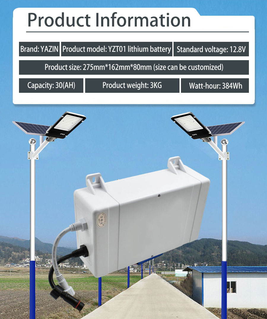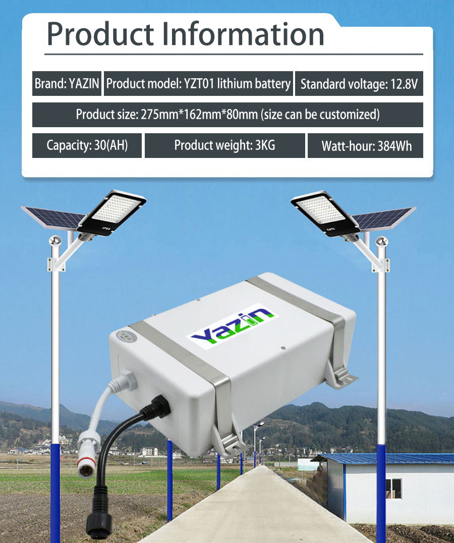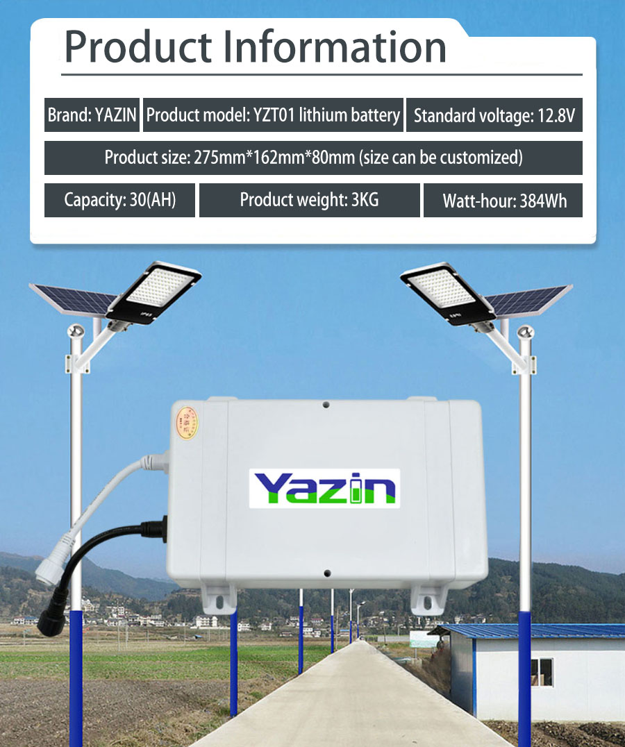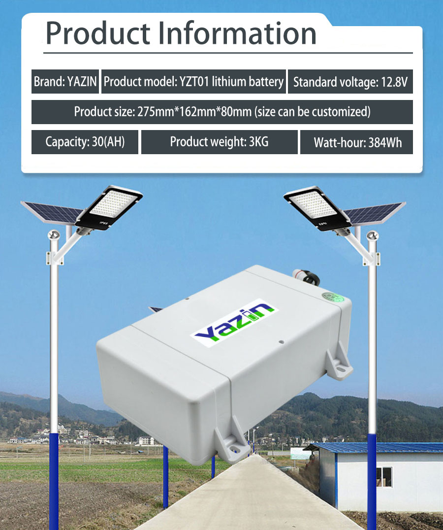 Brand : YAZIN , Product model:YZT01 Lithium battery , Standard voltage:12.8V , Capacity:30(AH) , Product size: 275mm*162mm*80mm(Size can be customized), Product weight:3kg , Watt-hour:384Wh